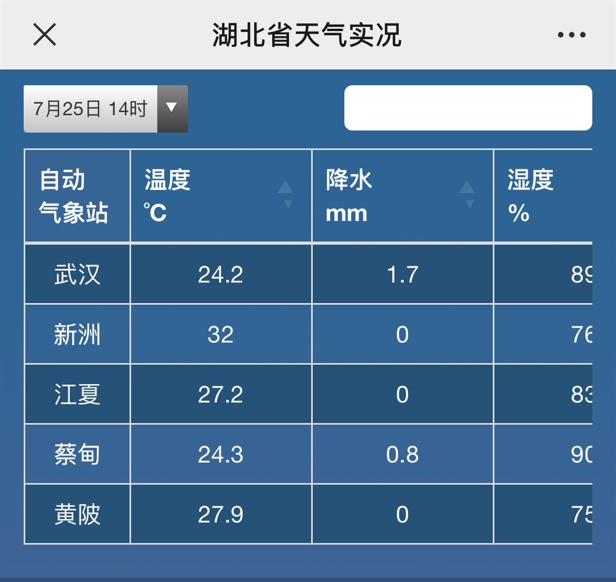 25日下午2时,武汉唯有新洲在30℃以上(来源:湖北气象)