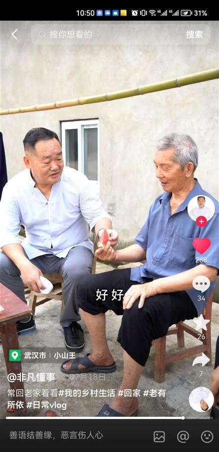 因为他发现,村里老人其实吃穿不愁,健康长寿,只是文化娱乐生活单调,缺少精神关怀、儿孙看望。经过考虑他决定,策划一系列的孝老爱亲、夕阳生活的短视频,陆续请老人们当“演员”出镜,剪辑完成后,发在抖音号上传播。