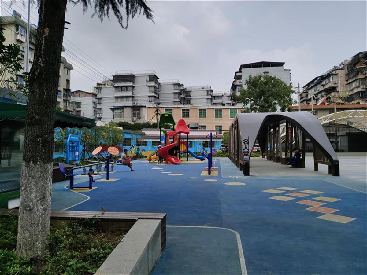 为了充分实现居民多元需求,社区利用大广场的空间,在长廊左侧设立了儿童乐园,在右侧则是重建的居民大舞台和绿化林荫步道。