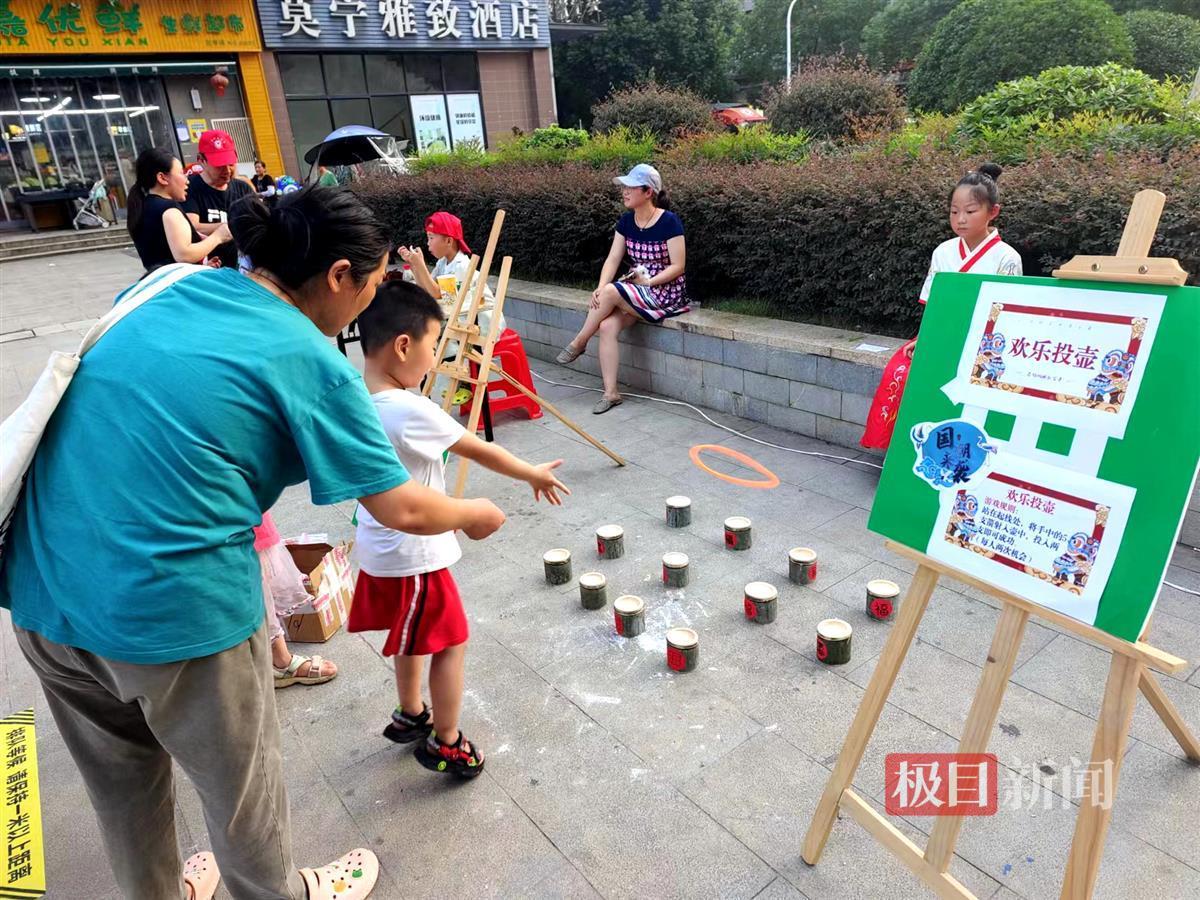 为了让居民体验传统游戏的乐趣,活动中设置了许多有趣的传统游戏项目,如百步穿杨、欢乐投壶、一圈福气、宋玩木射、诗词飞花令、踢毽子等,吸引了许多居民围观和参与。游戏区不时发出开心的笑声,传出“通关”的欢呼声,欢声笑语“点燃”了夏日的夜市。