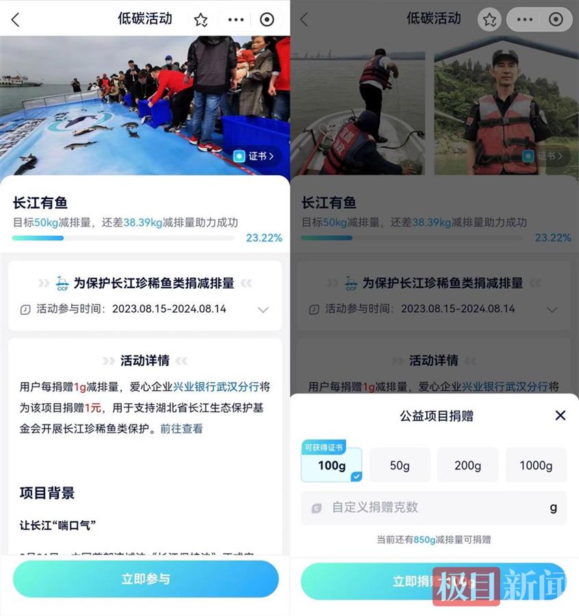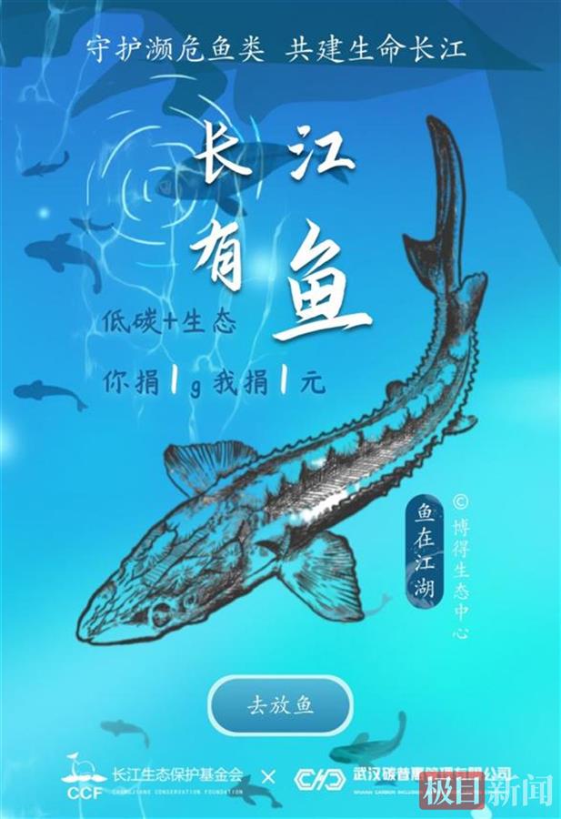 据了解,“长江有鱼”公益项目是“武碳江湖”联合湖北省长江生态保护基金会推出的以“碳”代捐创新公益筹款模式。用户每捐赠1g减排量给湖北省长江生态保护基金会,将有爱心企业为该项目捐赠1元,用于支持湖北省长江生态保护基金会开展长江珍稀鱼类保护。