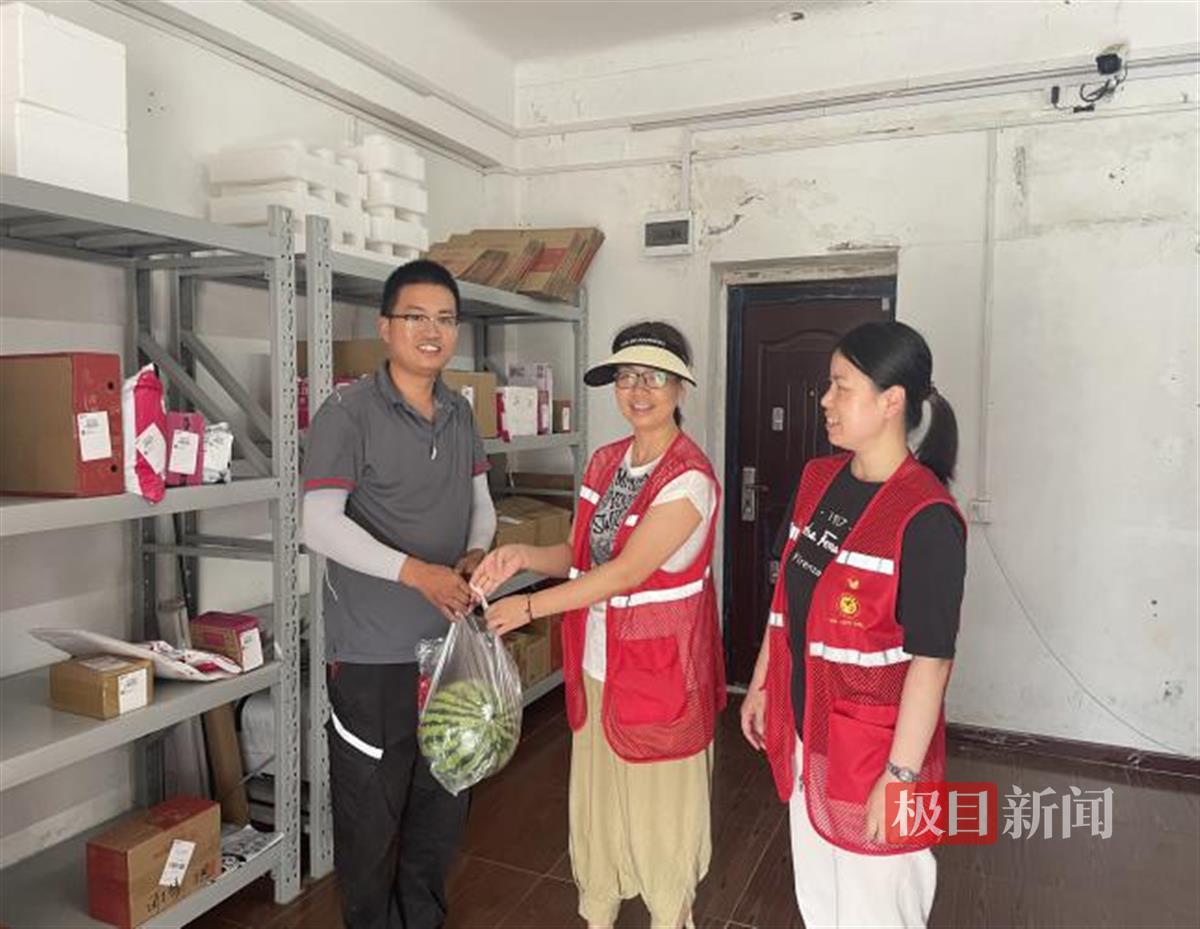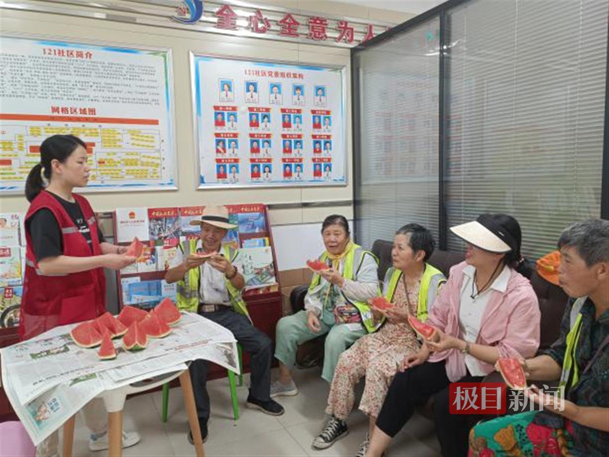 “午后室外太热了,趁着休息时间来到爱心驿站小憩,这里有空调有桌椅,还有冰西瓜,降暑又解渴,非常感谢社区‘江城蜂巢’。”一位正在江城蜂巢休息的环卫师傅笑着说。8月15日,武汉市青山区钢花村街道121社区江城蜂巢内,社区工作人员正在为辖区内的快递员、外卖员、保洁员等户外工作者切西瓜、送冰水,给在外奔波的他们送去盛夏清凉。