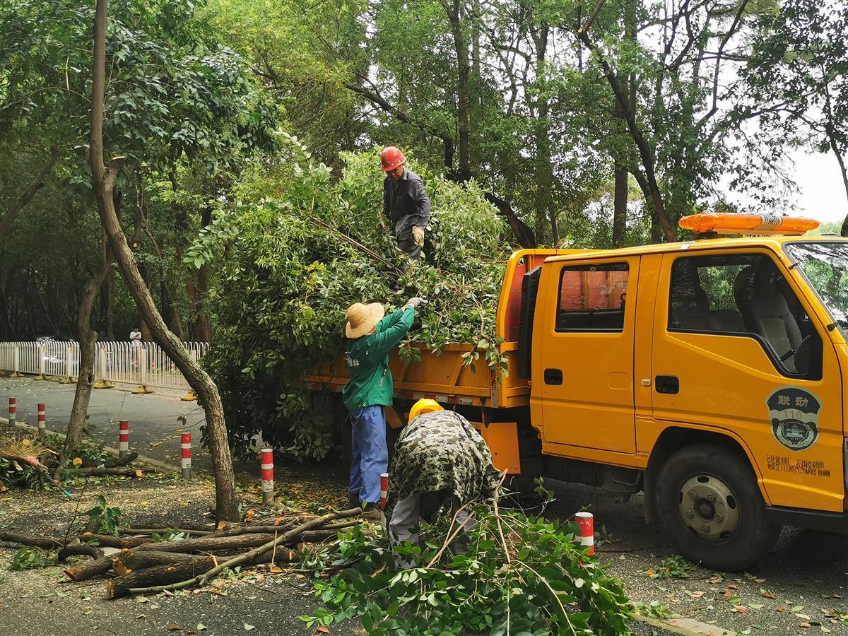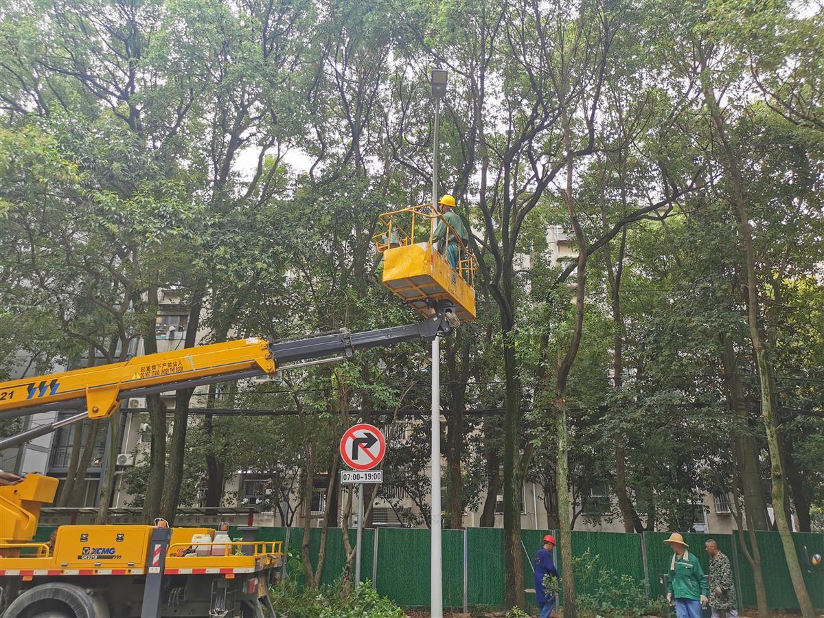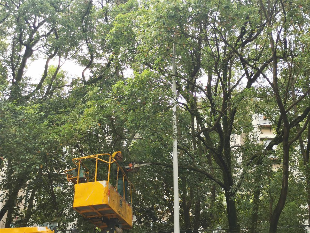 修剪过程中,根据住户居民要求,综合考虑绿化、采光、美观等因素,绿化工人在保证安全的前提下,利用升降车、修枝锯等工具,对高大树木进行修葺、规整,修剪下来的树枝也进行了及时清运。