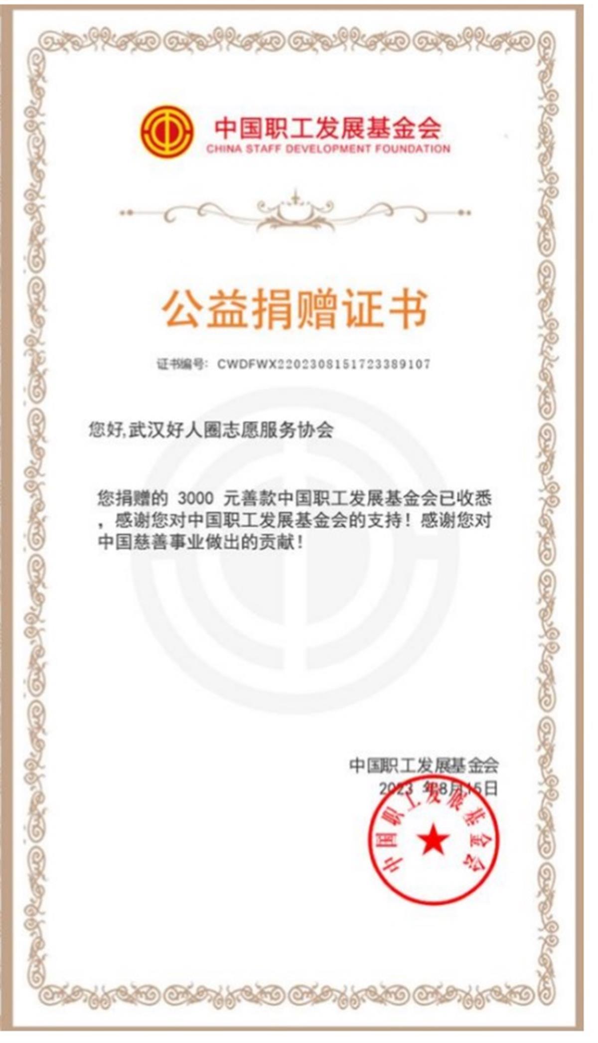 另悉,当日,武汉好人圈协会已将首批3000元爱心款,汇入了中国职工发展基金会的爱心账户。