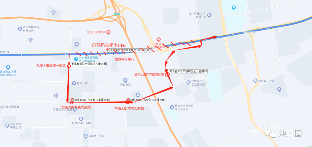 以上线路运营车辆由西往东运行至蔡甸区夸山辖区时,须在318国道与九康大道交会路口右转,经九康大道进入常福大街,过桥后进入武汉经开区,途经朱山湖大道、全力五路回到318国道正常运行。(以上须调整的公交线路均不再停靠白鹤泉东街土山站,增加停靠九康大道康湾一街站、常福大街九康大道站、常福大街常欢大道站、全力五路常福大街站)