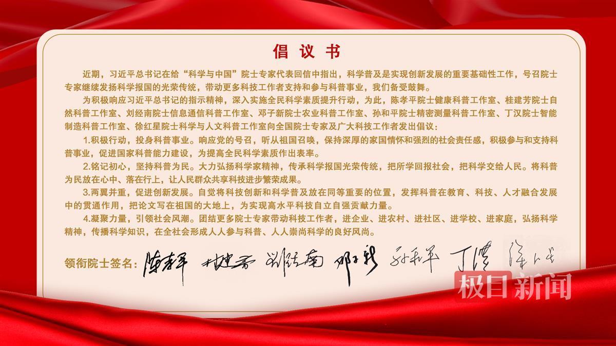 在8月22日召开的陈孝平院士健康科普工作室成立三周年暨院士科普工作室座谈会上,陈孝平、桂建芳、刘经南、邓子新、孙和平、丁汉、徐红星七名院士联名发起倡议,号召科技工作者积极响应习近平总书记给“科学与中国”院士专家代表回信的指示精神,深入推进科学普及事业,大力传承科学报国光荣传统,把所学回报社会,将科普工作放在心上、落在行动上,让人民群众共享科技进步成果,把科学交给人民,为提高全民科学素质贡献智慧和力量。中国科协专职副主席、书记处书记孟庆海,湖北省科协党组书记、副主席周德文,武汉市委副书记、市委政法委书记李义龙,武汉市人民政府副市长孟晖出席了会议。