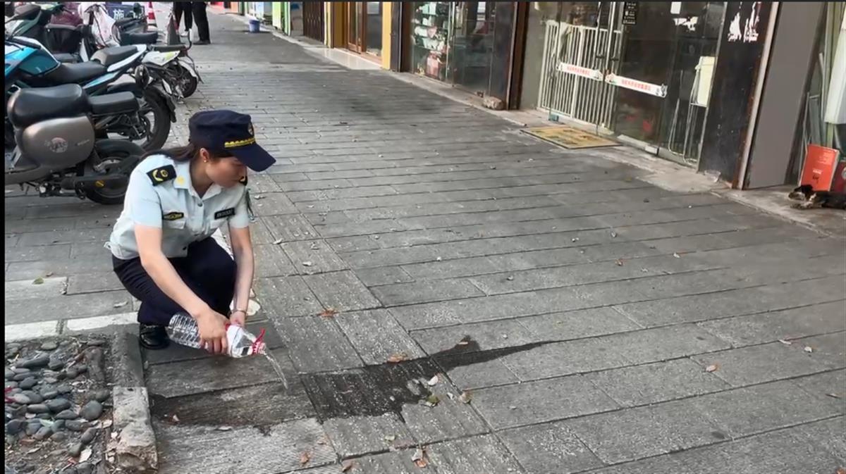 “难不成是树根顶起步砖造成路面倾斜?”为了验证猜想,城管路长拿出一瓶水做试验,她们将水泼在人行道步砖上后,只见水流迅速往店铺门口方向流去,而整条路上多个树穴附近都存在着“倒流”现象,“证明拱起的树根是雨水倒流的根源。”