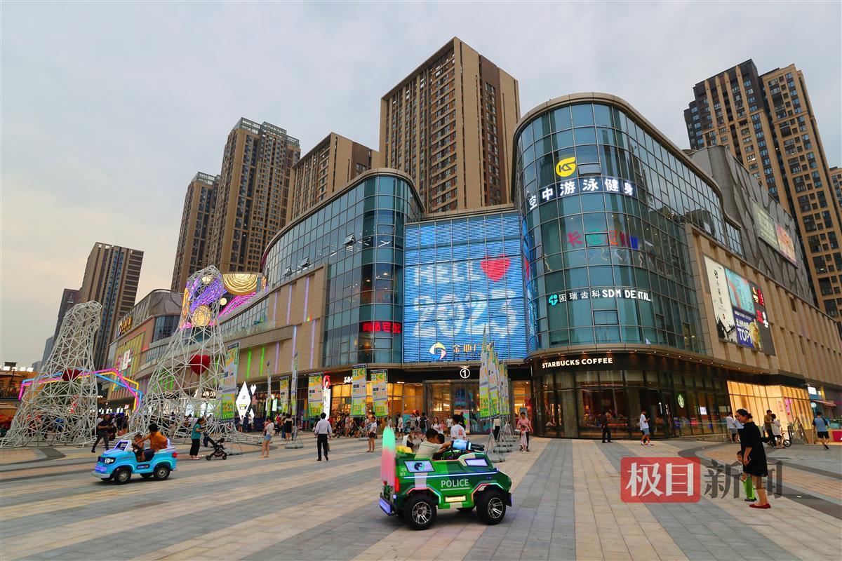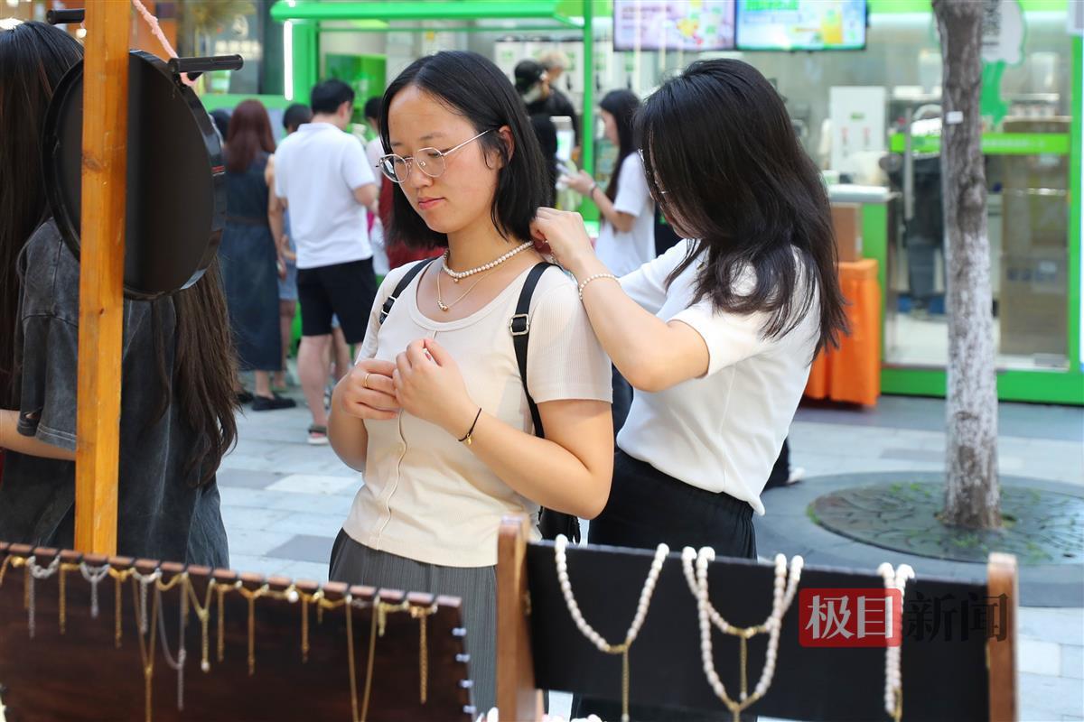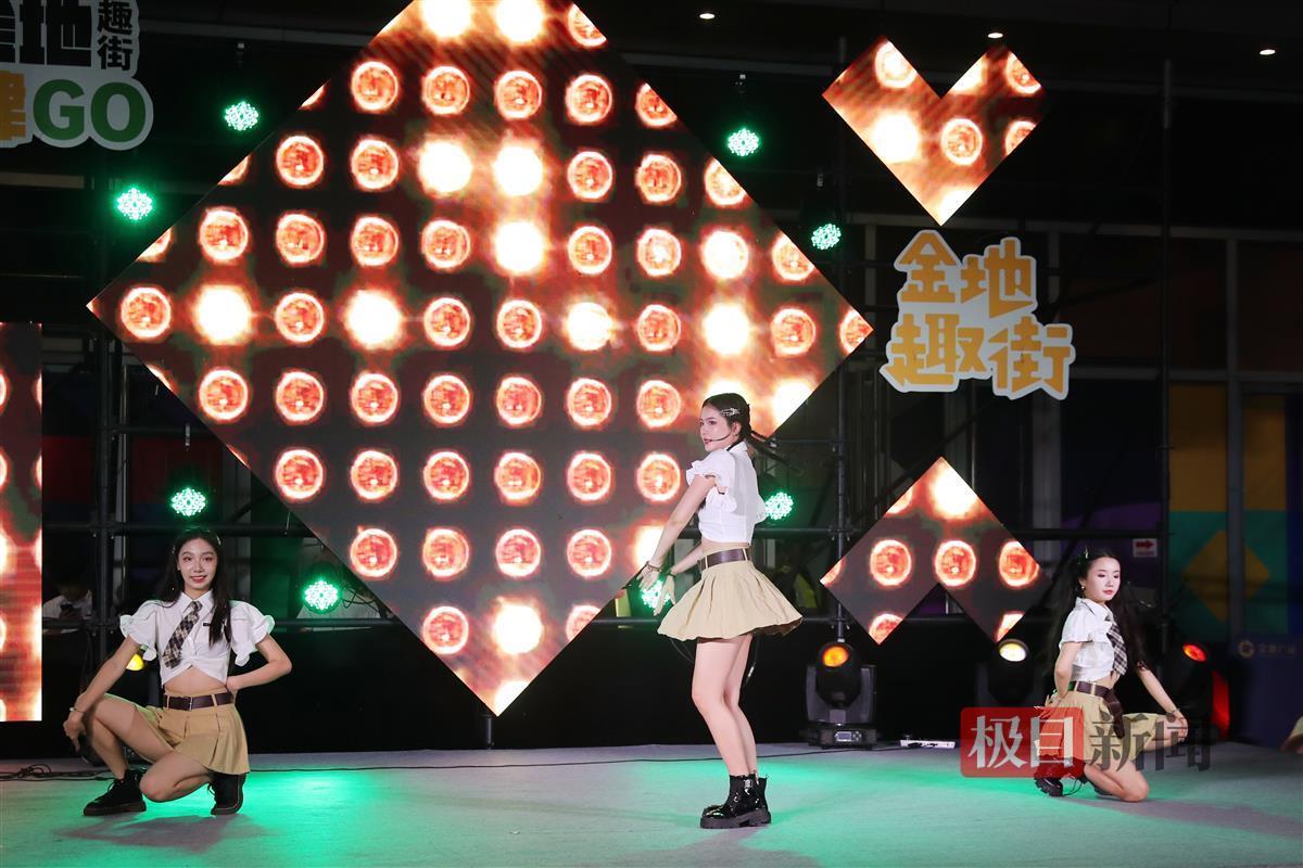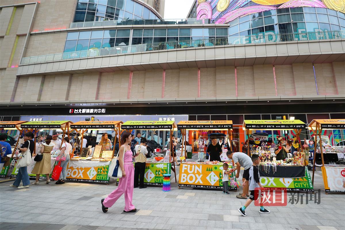 夜幕降临,华灯初上,整齐划一的摊位在金地广场一字排开。摊主的叫卖声、游客的交谈声、“趣玩电音趴”的音乐声此起彼伏,各色招牌光影交错,各种美食琳琅满目,各类小商品创意新潮,灯光璀璨中人潮涌动。市民游客赏夜景、逛夜市、品美食、看电影,沉浸式体验家门口的人间烟火。