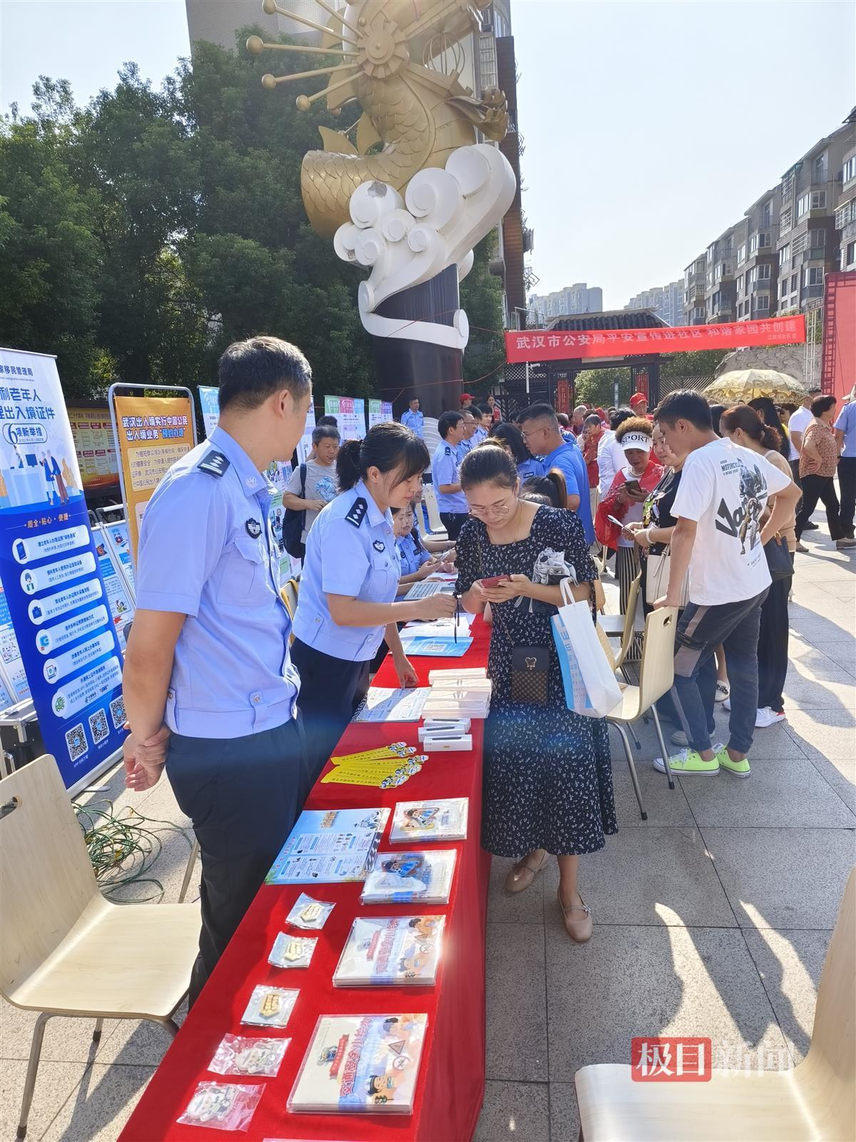 文艺演出部分在武汉特警的精彩战术表演中进入尾声。现场群众意犹未尽地离开座位,移步来到江欣苑社区广场。当天,市公安局和汉阳区公安分局在此设立了多个宣传展台,涵盖了禁毒、反诈、治安、交通、出入境等多个领域。同时,流动车管所也在现场为群众提供便捷服务。