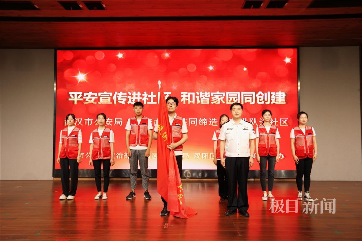 在热烈的气氛中,市公安局领导为汉阳分局立功民警颁奖,市禁毒办相关负责人为江堤街禁毒宣传小分队授旗。