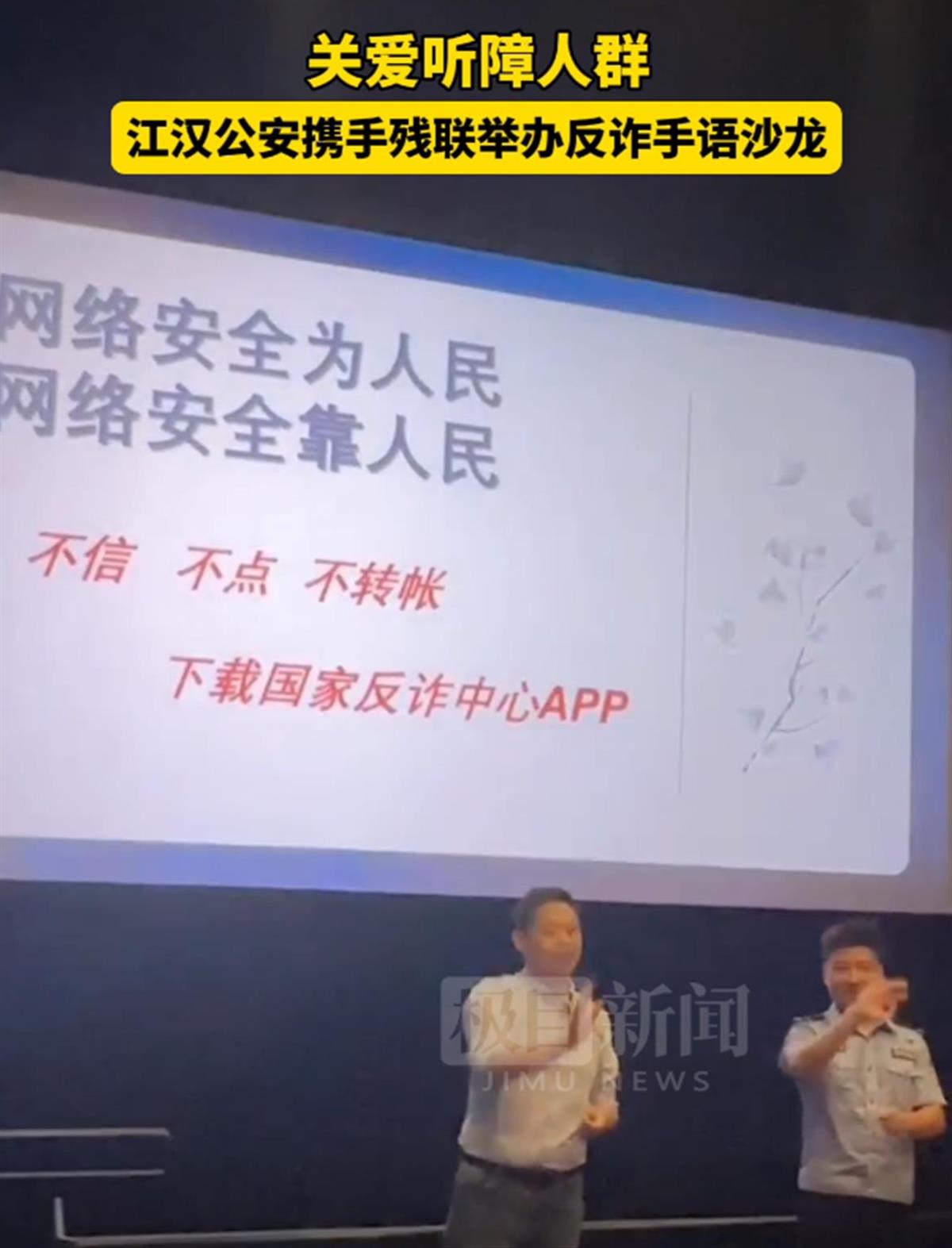 9月13日上午,武汉市公安局江汉区公安分局反诈宣讲团携手江汉区残联、江汉区聋人协会举办了一场特别的反诈宣讲,为现场50余名听障人士开展了一场反诈宣讲手语沙龙。