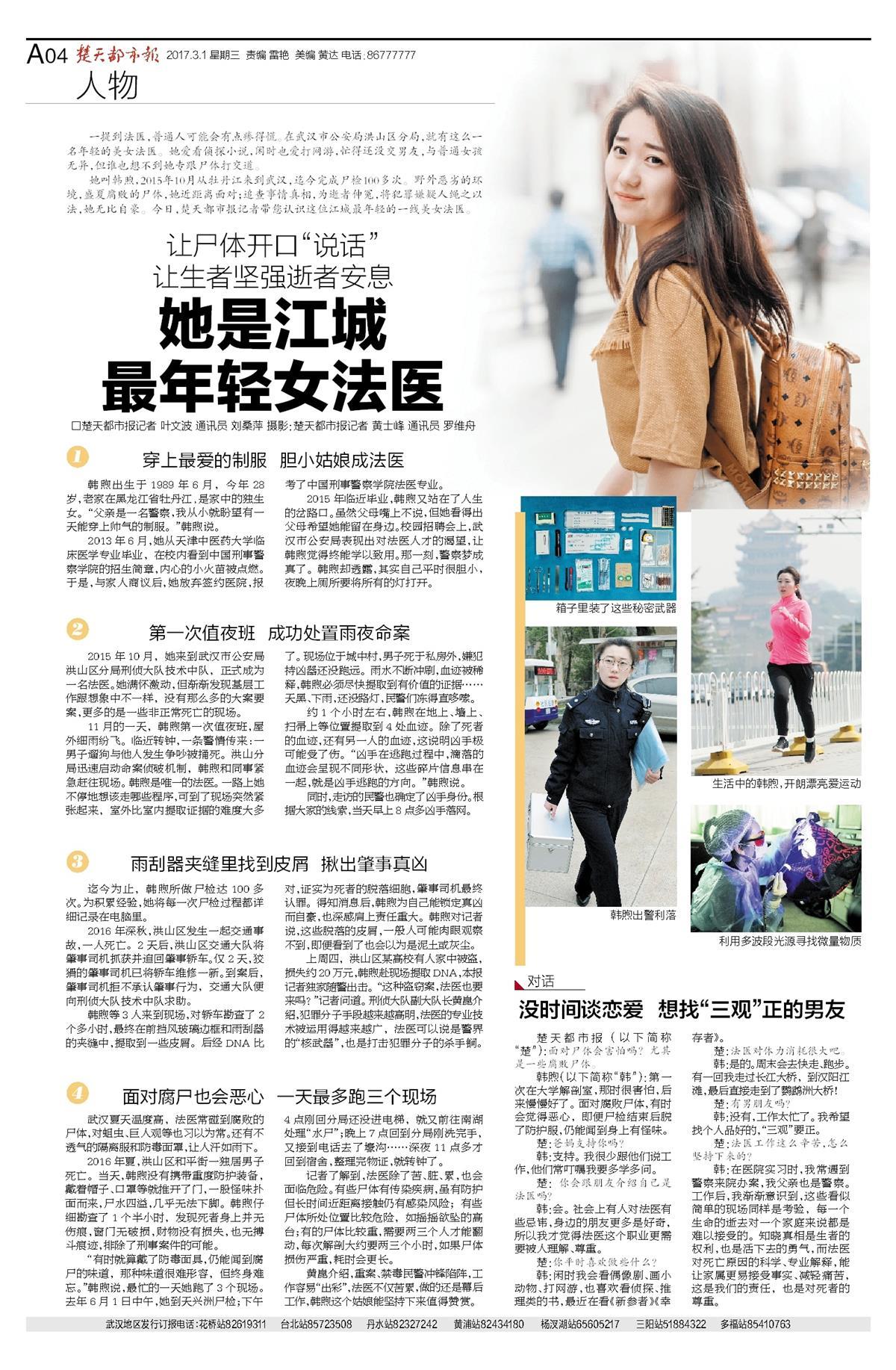 2015年,韩煦为了实现心中的警察梦,舍弃中医工作,重新学习法医专业。她怀抱着投身公安事业的职业情怀,孤身一人从祖国边陲黑龙江来到湖北武汉,成为一名基层刑侦单位的法医。她扎根基层、乐于奉献、爱岗敬业,她健康自信、积极向上,被誉为“江城最美女法医”。因工作成绩突出,她先后荣获武汉市劳动模范、武汉市“三八”红旗手、武汉市公安局“最美青年汉警”“全国抗疫先进个人”等荣誉。
