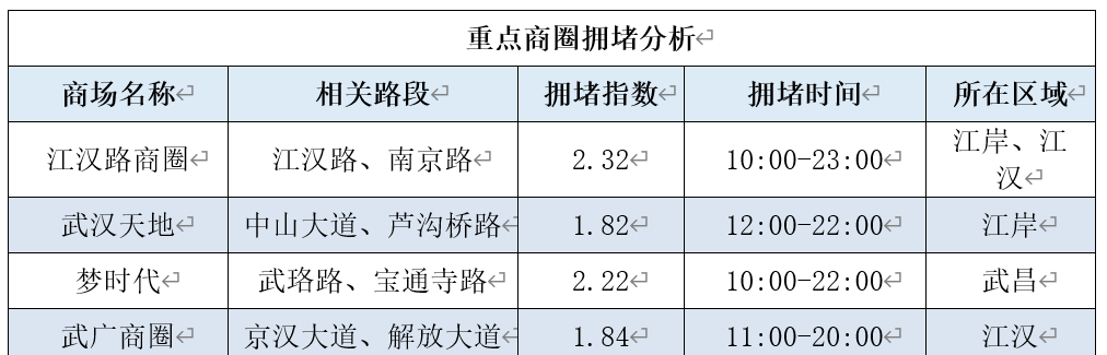 商圈方面,预计江汉路、武汉天地、梦时代、武广、汉正街等商圈,周边道路拥堵指数较高,部分道路容易出现短时拥堵。