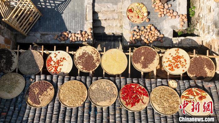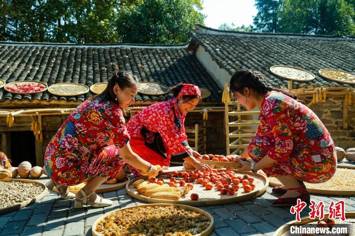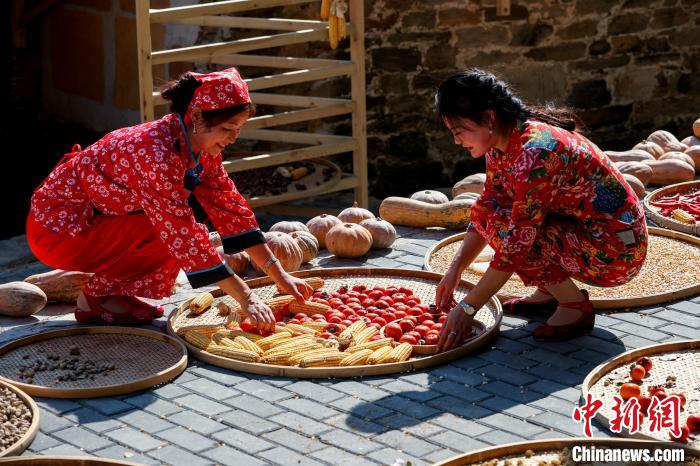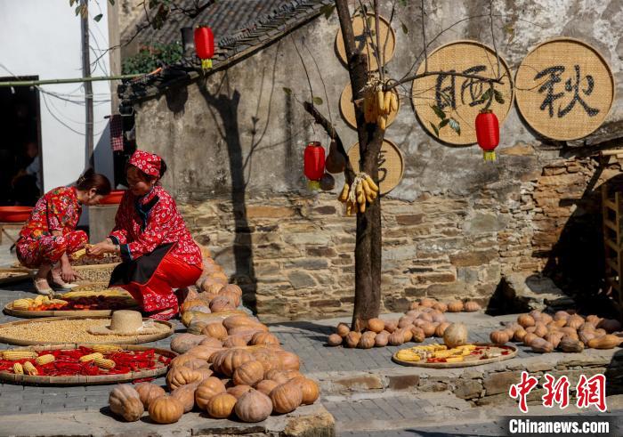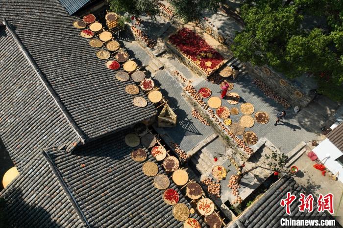 在武汉市黄陂区木兰乡大余湾,游客在体验晒秋。 中新网记者张畅摄