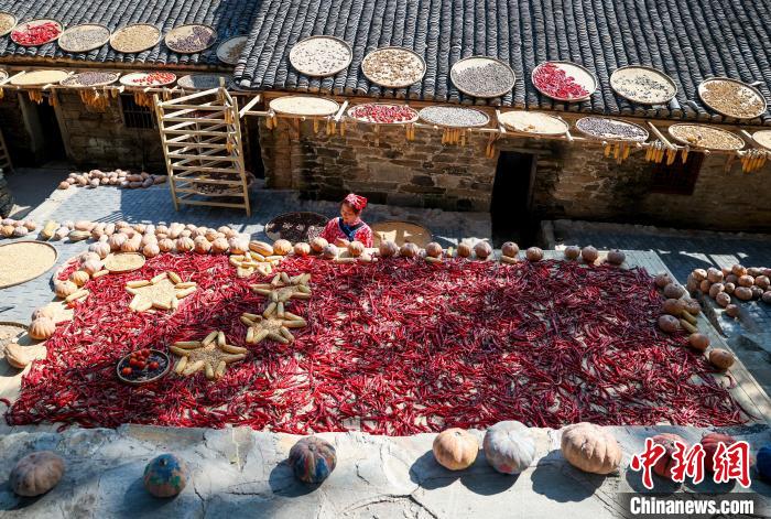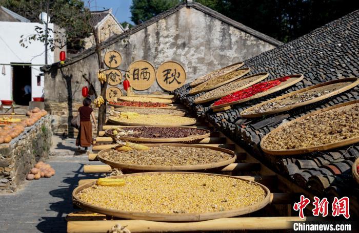 10月18日,在武汉市黄陂区木兰乡大余湾,游客在体验晒秋。金秋时节,武汉市黄陂区木兰乡大余湾农家屋檐下和场院里晾晒着稻谷、玉米、辣椒等农产品,丰收的喜悦扑面而来。