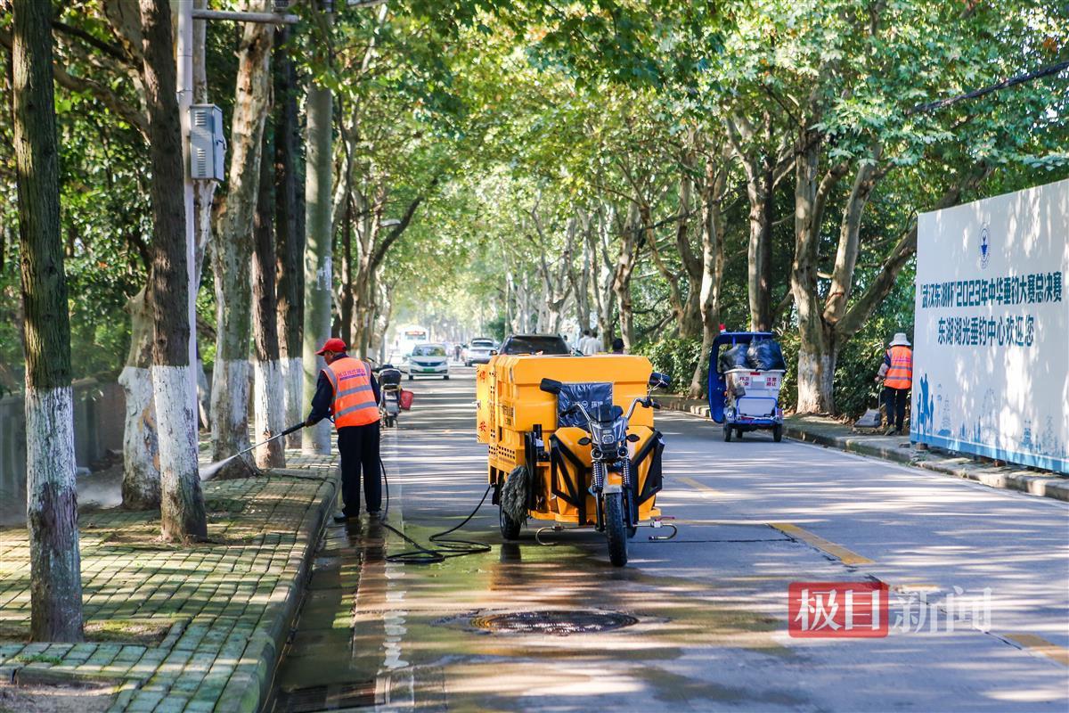 3辆高压冲洗车在落雁路进行集中作业,经过反复冲洗,道路本色尽显。与此同时,十几位环卫工人分散在落雁路各点位,同时对沿线开展地毯式清理巡查,做好道路环境卫生、市政设施、景观广告、市容秩序等整治工作,打好赛事保障“预备战”。