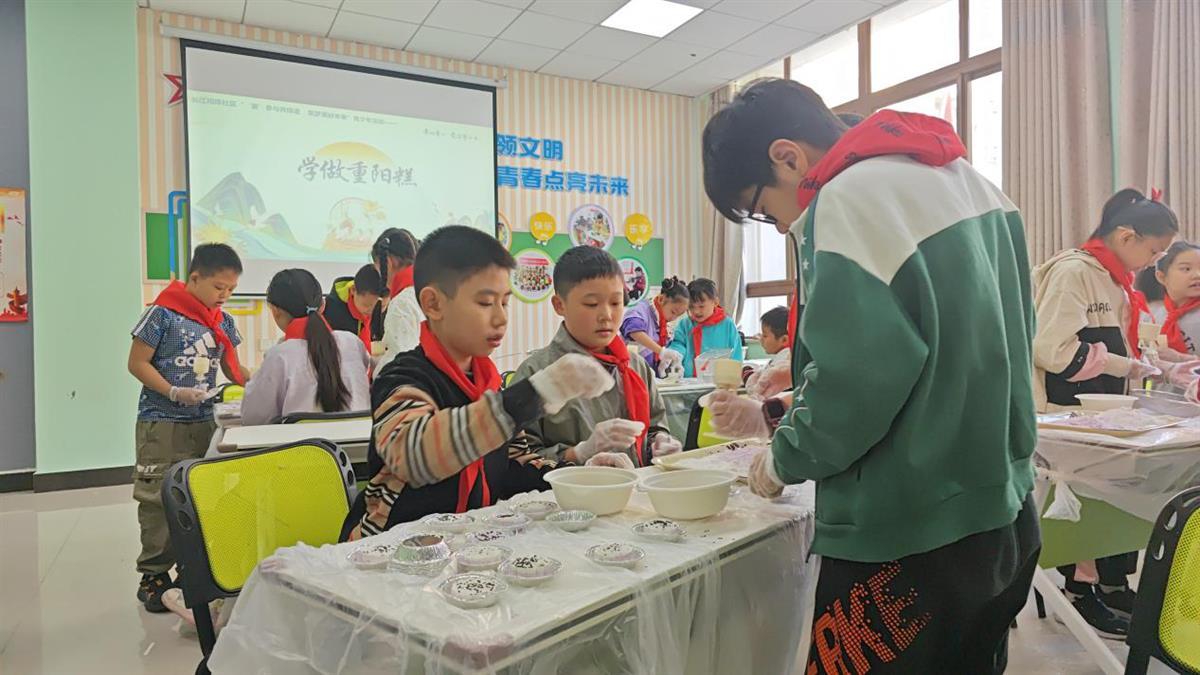 重阳糕,作为重阳节的一个重要民俗文化符号,“糕”与“高”谐音,吃糕意味着“持续高升,延年益寿”,含敬老惜老之情。少年儿童们在社区工作人员的指导下制作重阳糕,大家边听边跟着志愿者动手制作。称量、筛粉、铺馅、压模、包装……所有人都忙得不亦乐乎,笑容洋溢在每个人的脸上,纷纷表示要将美味带回去与家人一起分享。