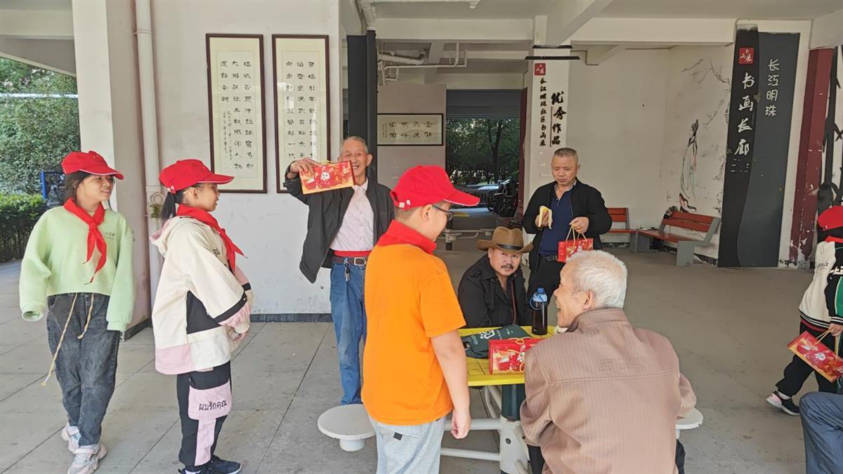做好重阳糕后,社区还组织了孩子们给小区老人送去重阳节礼物和节日问候。收到礼物的老人们纷纷称赞社区的活动办得好,其中79岁的冯奶奶还向孩子们回赠零食表示感谢。