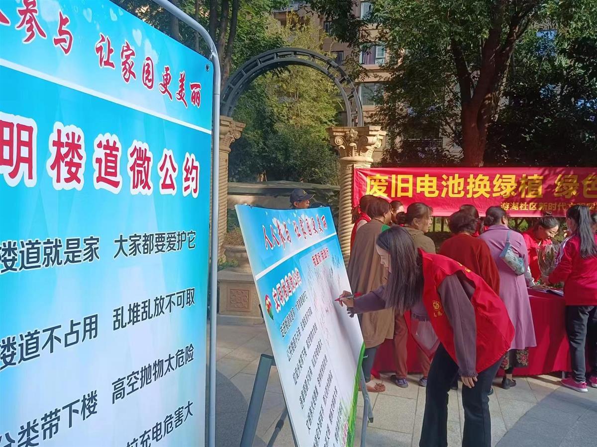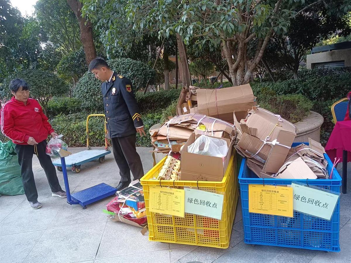 此外,广场一角还设置了专门的废品临时回收点,让废纸盒、空瓶子及时得到回收处理;广场另一处还开展了“废旧电池换绿植”活动,5至10节电池可以兑换一盆绿植,吸引了众多居民的参与。居民们对这样变废为“绿”的新方式很感兴趣,居民刘女士说:“这样的活动很有意义,使我们树立了垃圾分类、保护环境的意识。”居民王大姐也告诉记者,这样不仅减少了楼道空间的占用,还减少了废弃物对环境的危害,更有利于保障大家的生命安全。