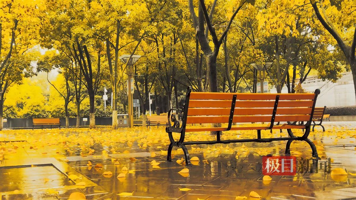 洪山广场林荫休闲广场上,落叶铺成了一条金黄色的地毯,与旁边高大的无患子、南天竹等植物融合在一起,在蓝天暖阳下文艺范十足,引来游客竞相拍照。