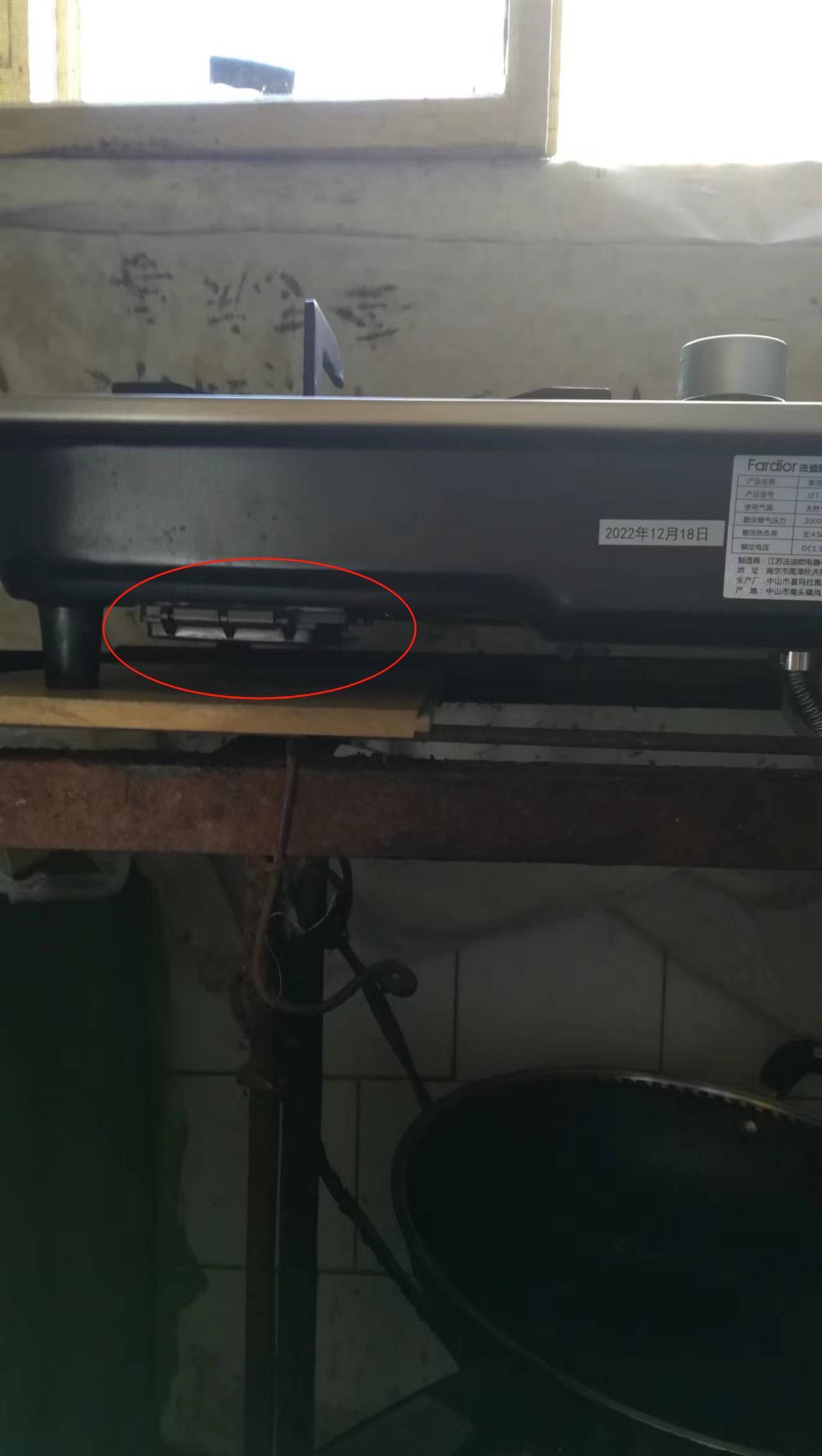 宗先生家中燃气灶,红圈内为电池盒