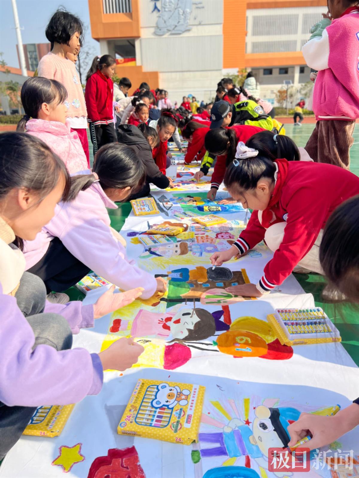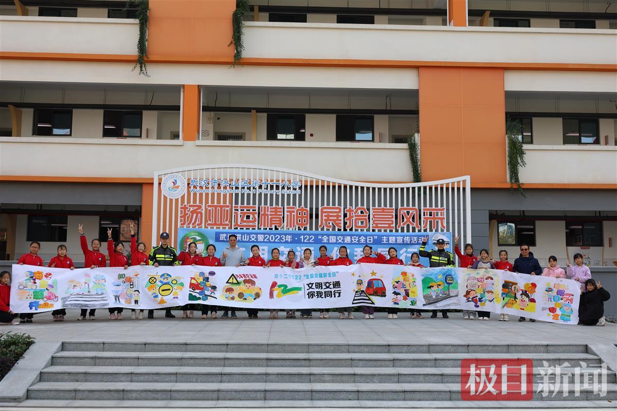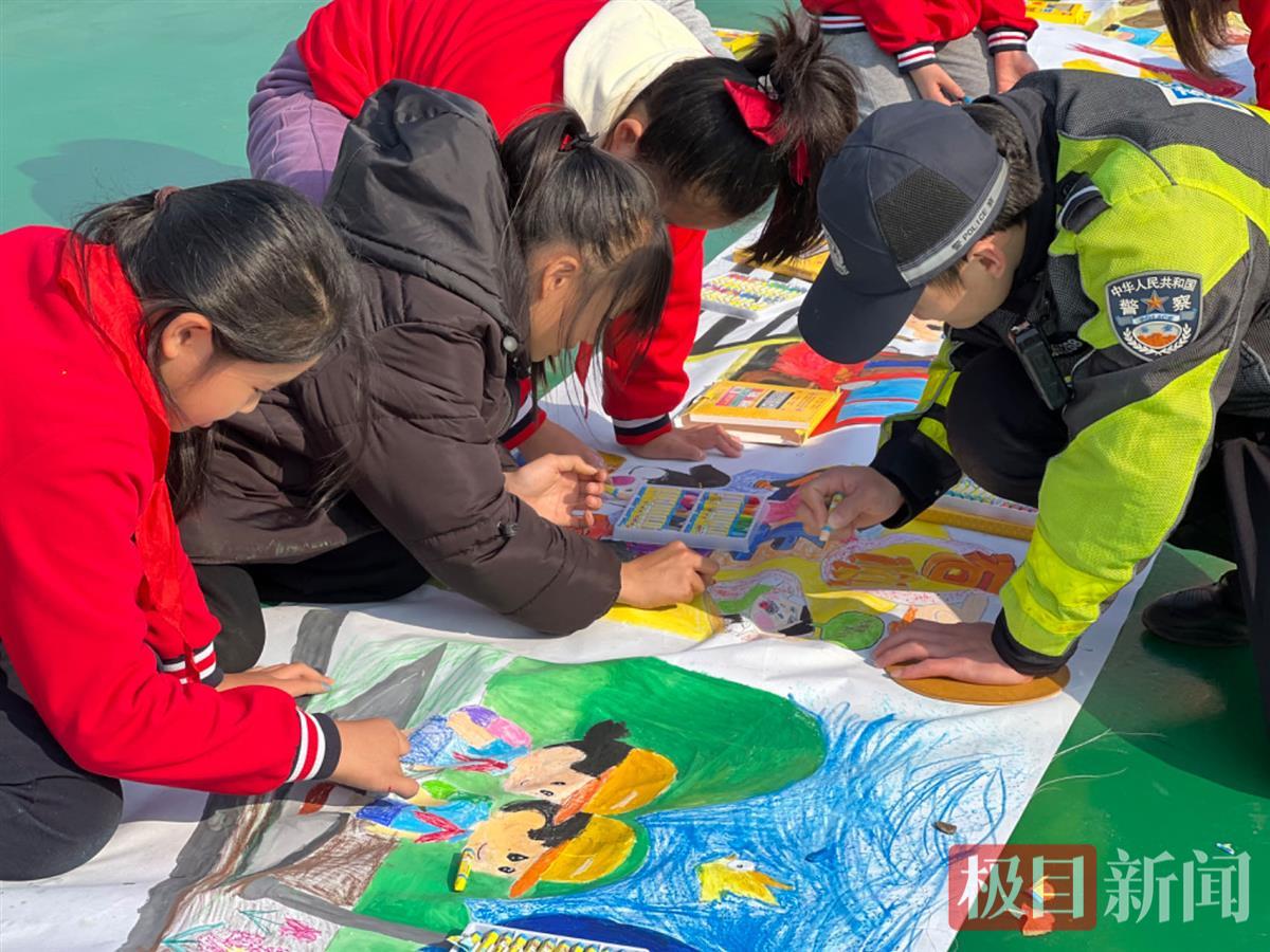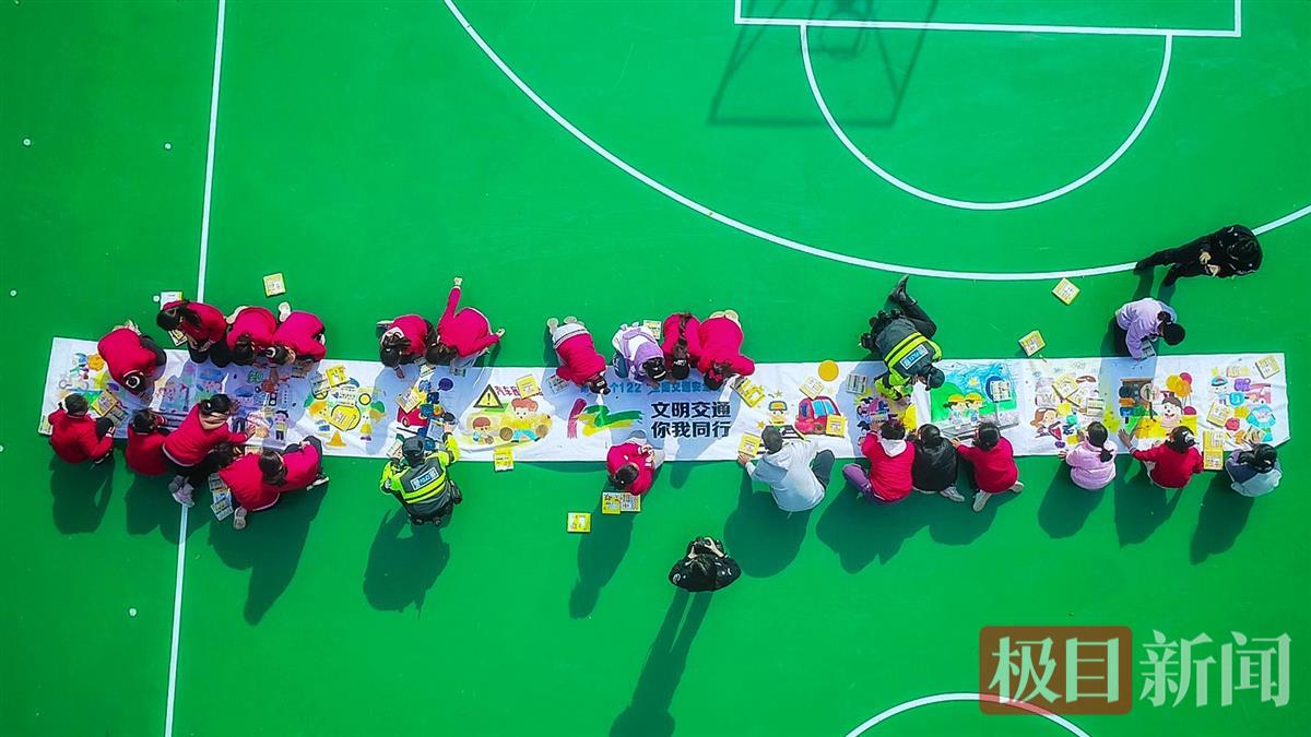 冬日暖阳融融,在洪山区第十一小学的操场上,一块12.2米长的巨幅画布展开,同学们和交警叔叔一起用手中的画笔,共同创作出一幅122交通安全主题画卷。