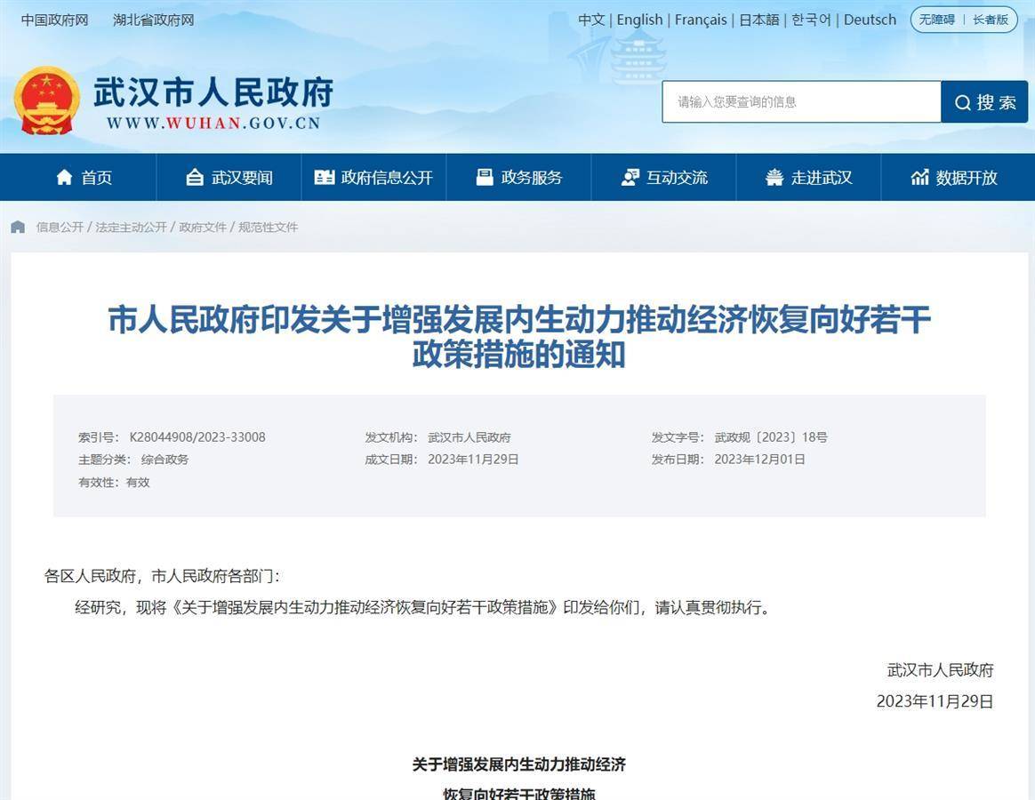 12月1日,武汉市人民政府印发《关于增强发展内生动力推动经济恢复向好若干政策措施的通知》,其中提出支持刚需和改善性住房需求、促进房地产投资、推动建筑业高质量发展等3项措施。