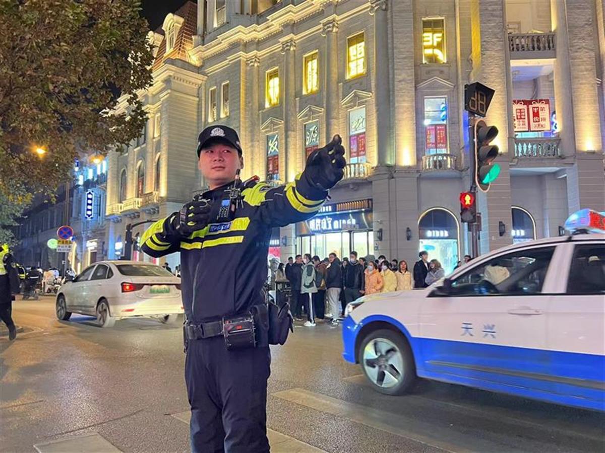 跨年夜,跳江救人的“见义勇为勇士”、硚口区交通大队辅警韩靖,和同事一起在利济路口执勤。到汉正街夜市来游玩购物的群众摩肩接踵,韩靖马不停蹄地疏导车流,提醒劝导电动自行车不要随意穿行、注意安全。