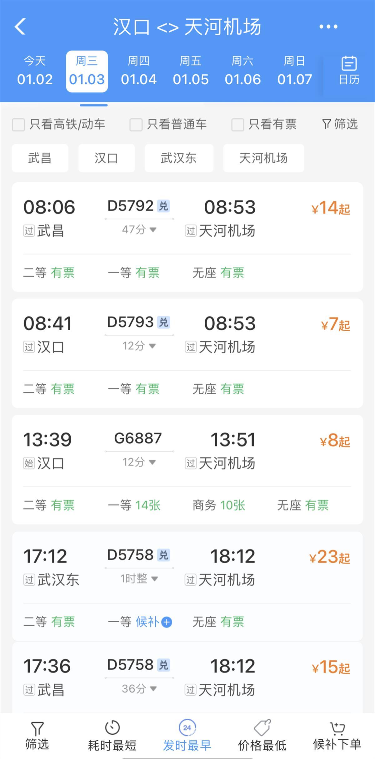 以1月3日为例,从武汉市区抵达天河机场共有8个车次。最早一班为8时06分从武昌火车站出发,47分钟抵达武汉天河机场;最晚一班为21时27分从汉口火车站出发,12分钟抵达武汉天河机场。这8个车次中,除了武昌火车站和汉口火车站,还有17时12分从武汉东站出发的火车。