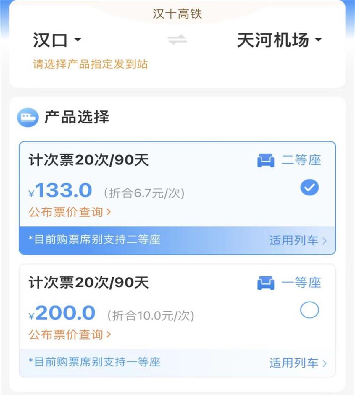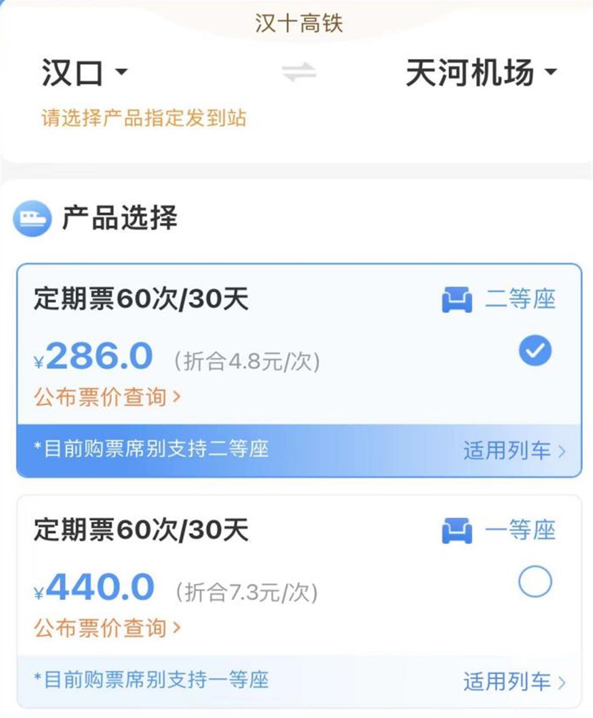除了单次票,旅客还可以购买定期票。其中20次/90天计次票,可在90天有效期内,乘坐20次在指定线路开行的、购买产品时指定发到站和指定席别的列车;30日定期票,可在30天有效期内,最多可乘坐60次在指定线路开行的、购买产品时指定发到站和指定席别的列车。以汉口火车站至天河机场为例,20次二等座票价为133元,一等座票价为200元;30日定期票二等座票价为286元,一等座票价为440元。