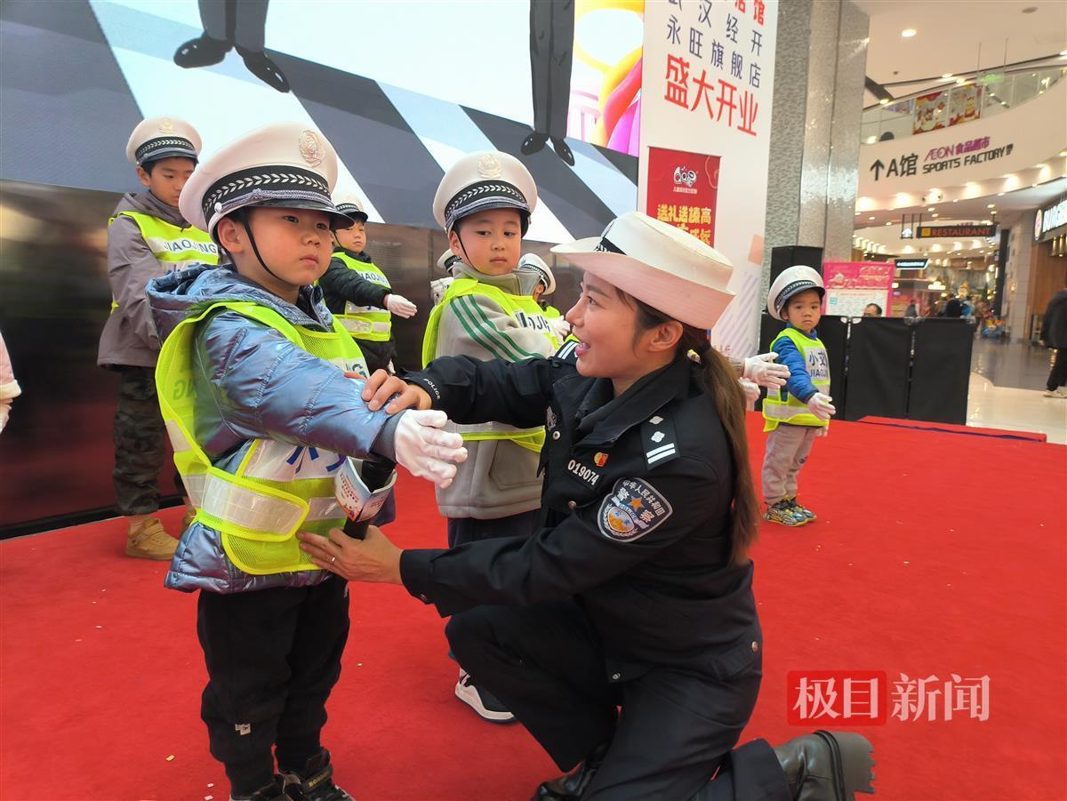 元旦假期,交通安全宣传不打烊。1月1日上午,经开区交通大队来到经开永旺梦乐城,与相关企业共同开展新年交通安全第一课活动。孩子们头戴白色小警帽、身穿黄色小马甲,兴致勃勃地上台做游戏。民警钱春俐通过PPT向孩子和家长、市民宣讲“一盔一带”、交通信号灯等交通安全知识,带领孩子们学习交通安全手势操。