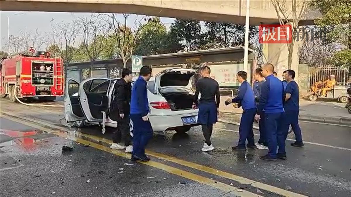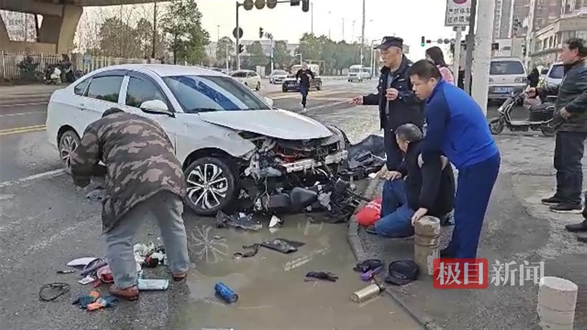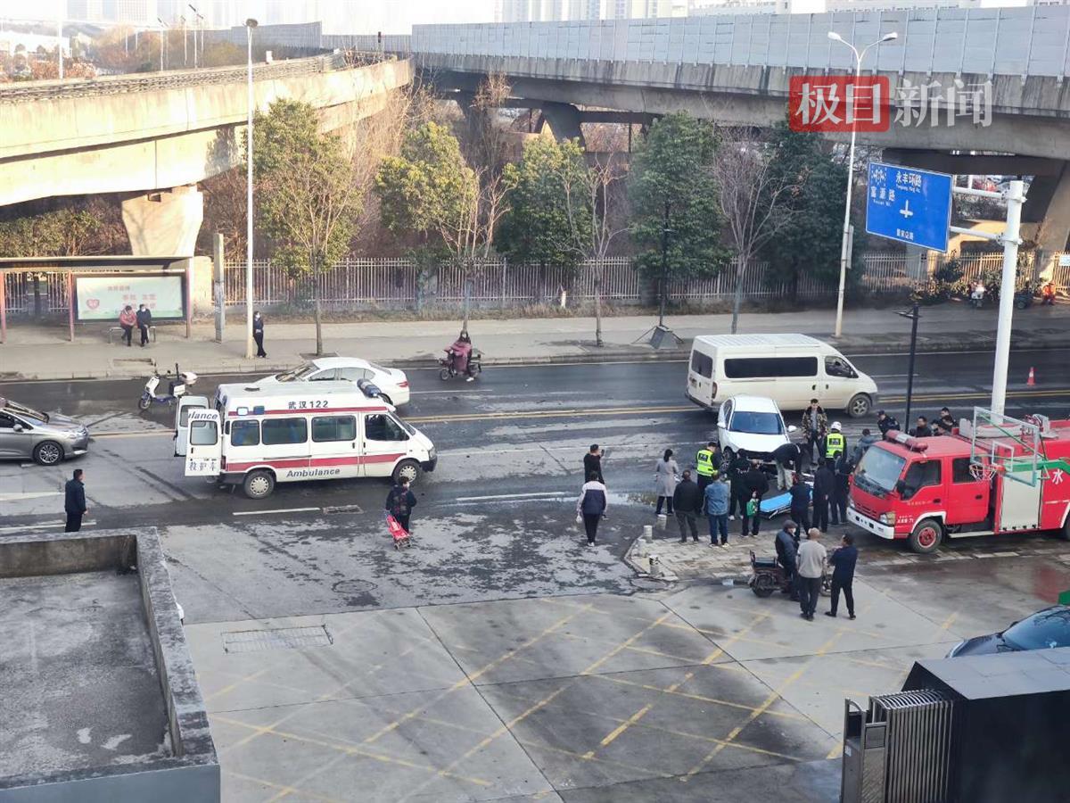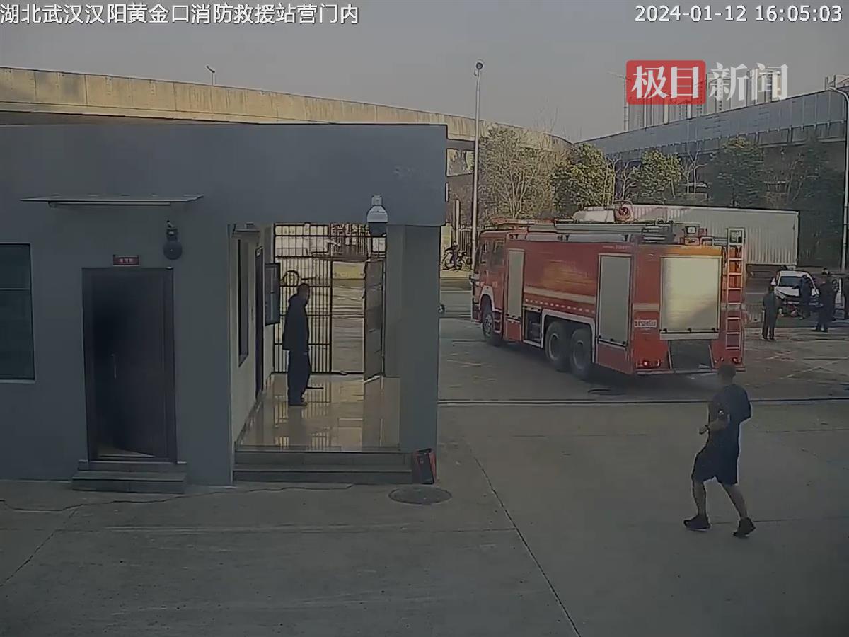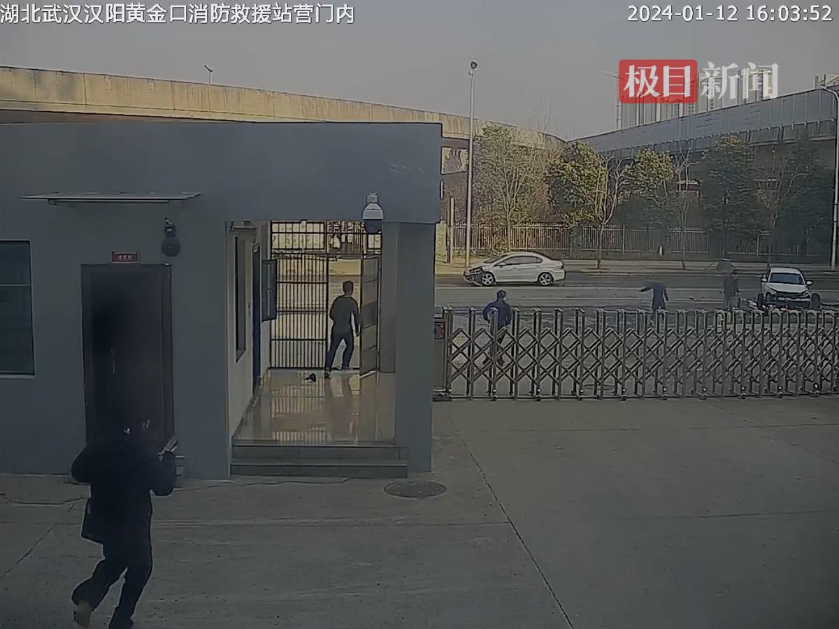 2024年1月12日16时03分,武汉市汉阳区永丰环路黄金口消防救援站门口,两辆汽车相撞后,其中一辆汽车失控撞向两名正在骑电动自行车的路人。此时,正在站内训练的消防员听到碰撞声后,立即从站内冲出查看情况。