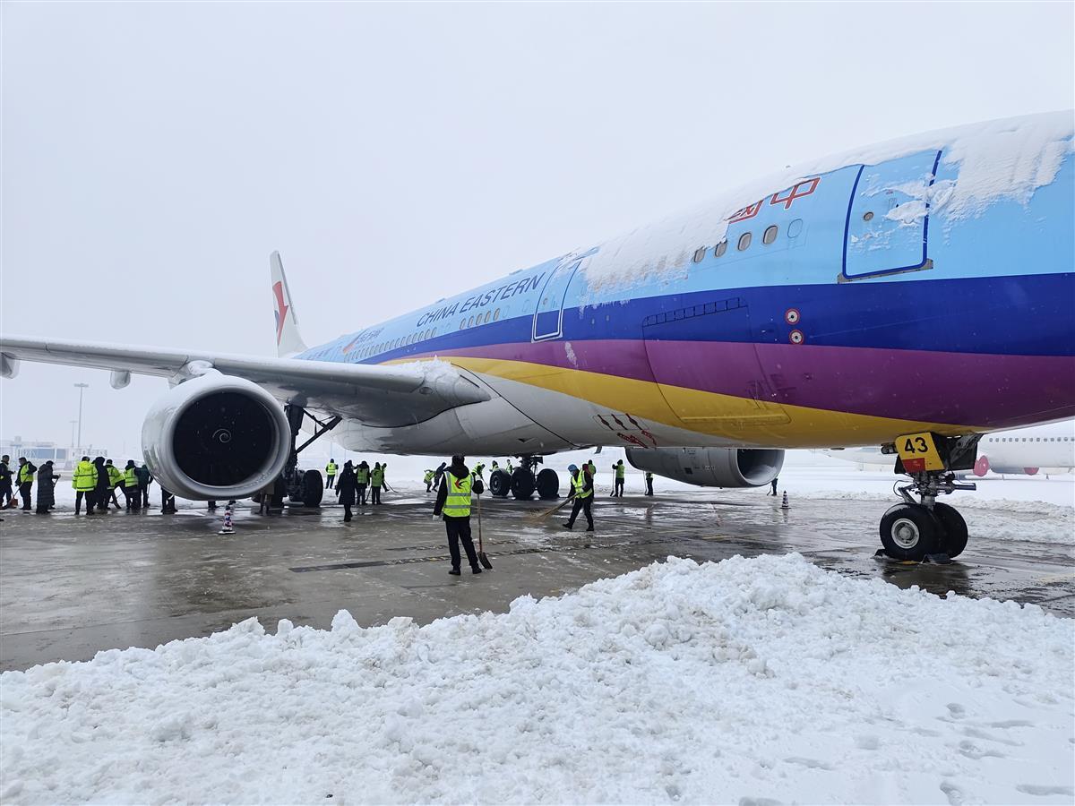 东航武汉公司工作人员介绍,4日清晨,该航司机务工作人员在停机坪上清理停机位冰雪以及飞机机身覆雪。客梯车前,地服员敷设防滑地毯,确保旅客下机安全。在登机口前,地服工作人员为旅客做好航班延误解释安抚工作。航站楼售票柜台前,工作人员组织旅客排队有序进行客票退改签,全力保障旅客出行需求。