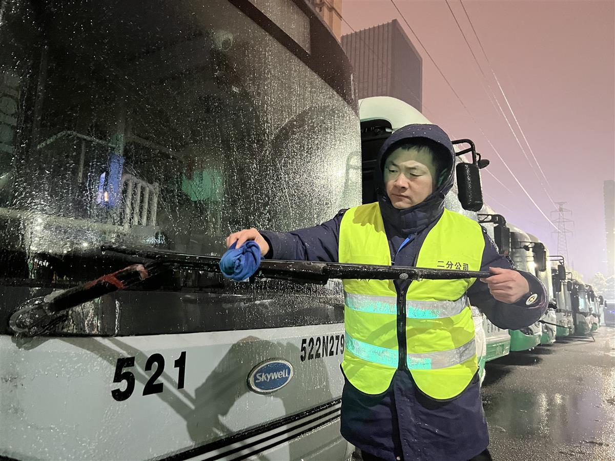 为确保车辆在冰雪天气中的性能稳定,各线路工作人员每天提前一两个小时到岗,做好出车前的车辆例检工作,对车辆轮胎、雨刮、防冻液、制动系统、灯光等关键设施设备进行检修,杜绝车辆“带病”上路;提前开启暖风,提升乘客乘坐的舒适度;在公交车上下门台阶处铺设防滑草垫,在公交站台、场站候车区撒盐融雪,清理积雪积冰,逐车对驾驶员“打安全招呼”,提醒乘客注意上下车安全。充分备足防滑链、工业盐、防滑草垫、警示标牌、三角木、三角架等防滑防冻物资。夜间车辆停运后,及时落实防寒防冻措施,车头一律朝南停放,玻璃上喷洒盐水或罩上防寒罩等。同时,武汉公交集团还组织3000余名党员和志愿者落实“门前三包”,扫雪除冰,为城市保畅贡献力量。