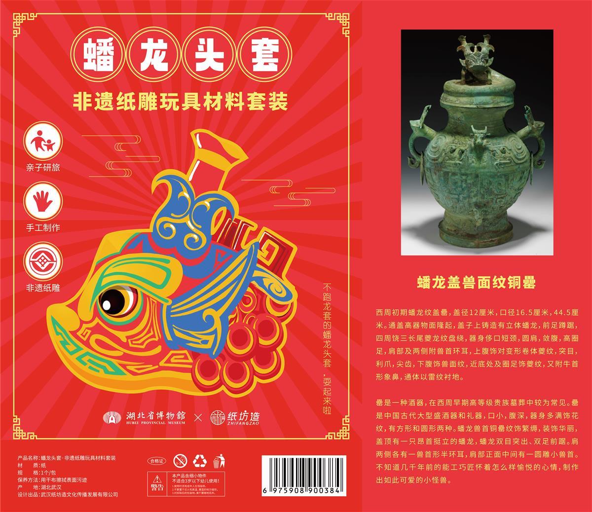 湖北省博物馆萌龘小蟠龙DlY头套上新啦!近日,设计灵感来源于“网红”文物蟠龙盖兽面纹铜罍的文创产品亮相湖北省博物馆,该文创产品由武汉江夏非物质文化技艺“纸坊造”设计。