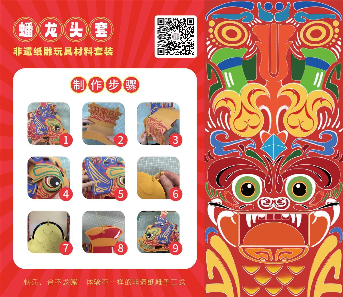 据介绍,纸坊非遗纸雕作为一种具有悠久历史的民间艺术,具有独特的艺术魅力和文化内涵。这款“萌龘小蟠龙DlY头套”旨在将传统中国龙形象与非遗纸雕艺术相结合,龙鳞、龙须、龙眼等细节部分均经过精心刻画,以红、黄为主色调,辅以蓝、绿色等传统色彩,使整个头套色彩丰富、对比鲜明。