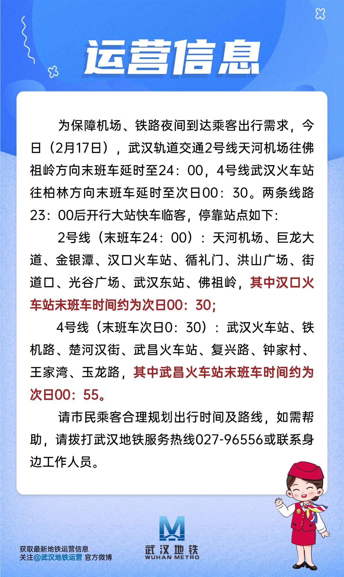17日,极目新闻记者从武汉地铁运营公司了解到,为保障机场、铁路夜间到达乘客出行需求,今日(2月17日),武汉轨道交通2号线天河机场往佛祖岭方向末班车延时至24:00,4号线武汉火车站往柏林方向末班车延时至次日00:30。两条线路23:00后开行大站快车临客,停靠站点如下: