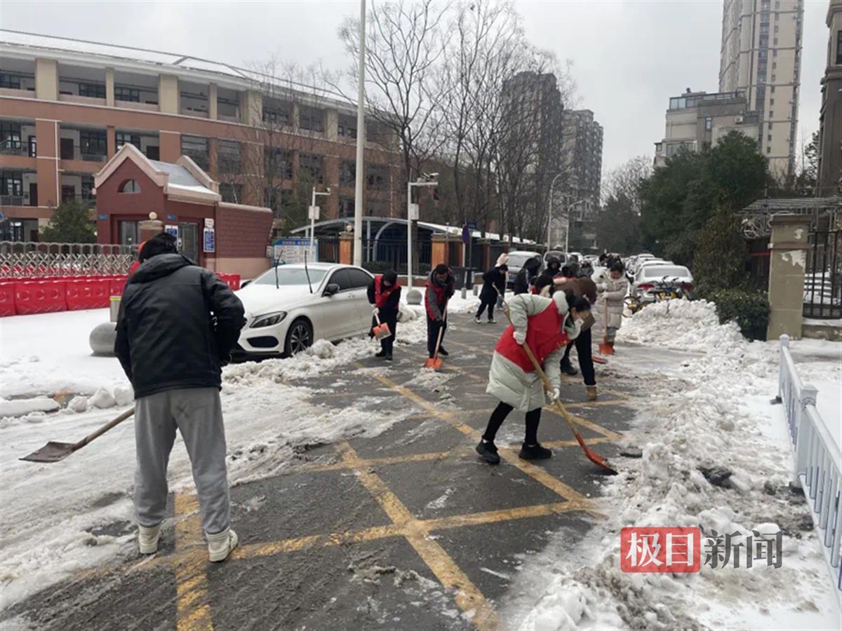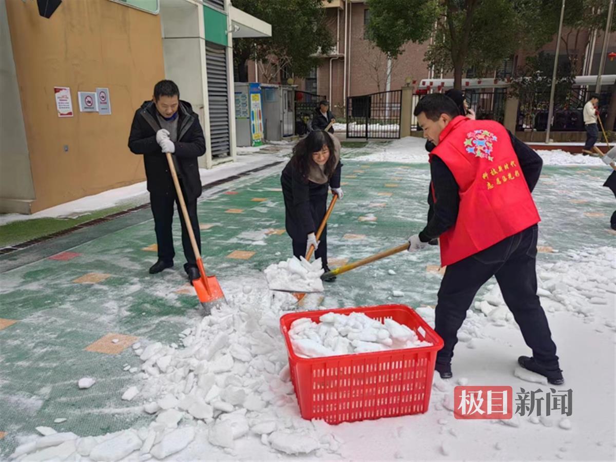 这样的铲雪队伍和身影,连日来在东西湖各个学校门口及周边随处可见,抡起铁锹、挥着雪铲,人人争当破冰除雪“战斗员”。