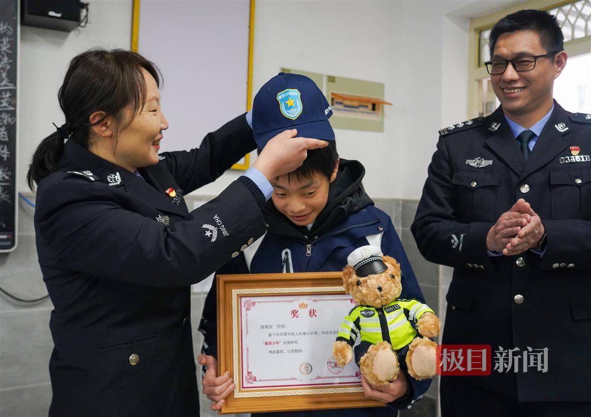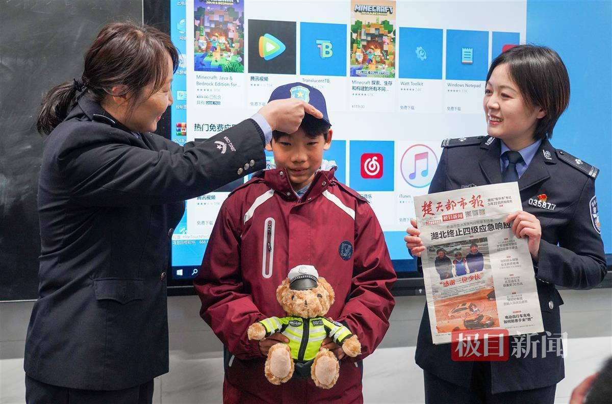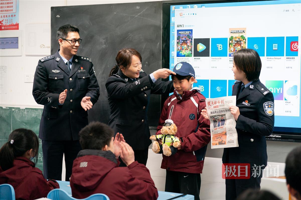 “鉴于你们为平安武汉付出的努力,现邀请你们加入武汉少年警队,让我们一起为理想而奋斗!”洪山公安治安大队民警杨燕梅发出邀请。当三位少年戴上武汉少年警队的帽子时,教室内顿时响起热烈的掌声。