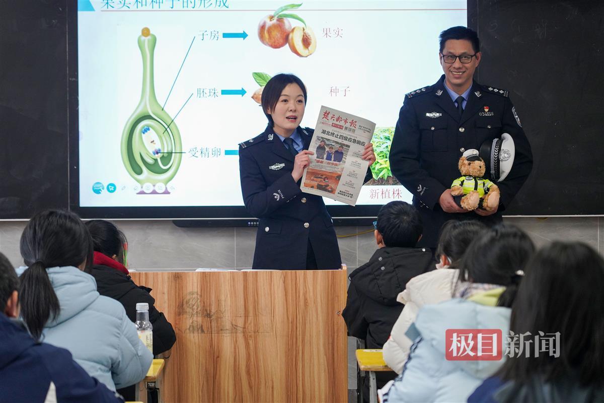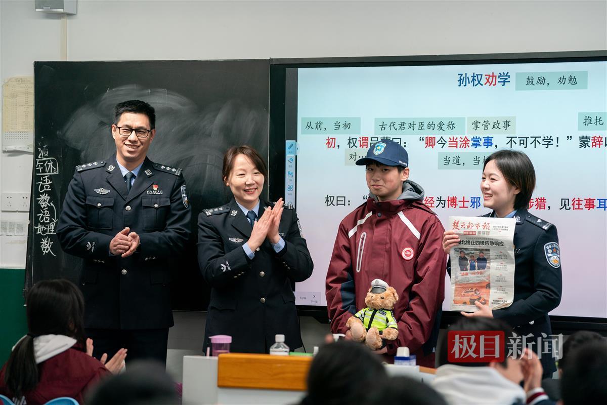 2月26日,正值开学第一天,武汉洪山警方深入校园宣讲安全知识,民警先后来到三人所在的班级,为孩子们带来“开学第一课”。“同学们,你们知道班上的少侠是谁吗?”民警张珏菡提问后,班上顿时炸开了锅,孩子们异口同声地给出了答案。张珏菡拿起报纸介绍起三人的事迹,三位少年在同学们的掌声中登上讲台。