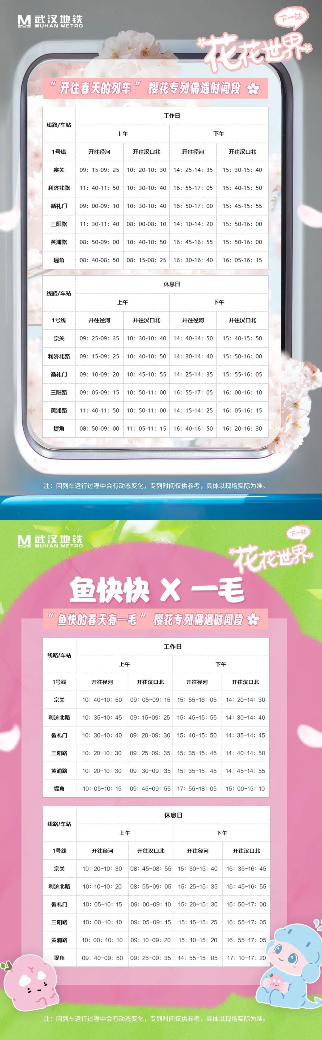 3月20日起,武汉地铁1号线樱花专列——“鱼快的春天有一毛”主题列车上线运营。至此,1号线共有3列樱花主题列车。