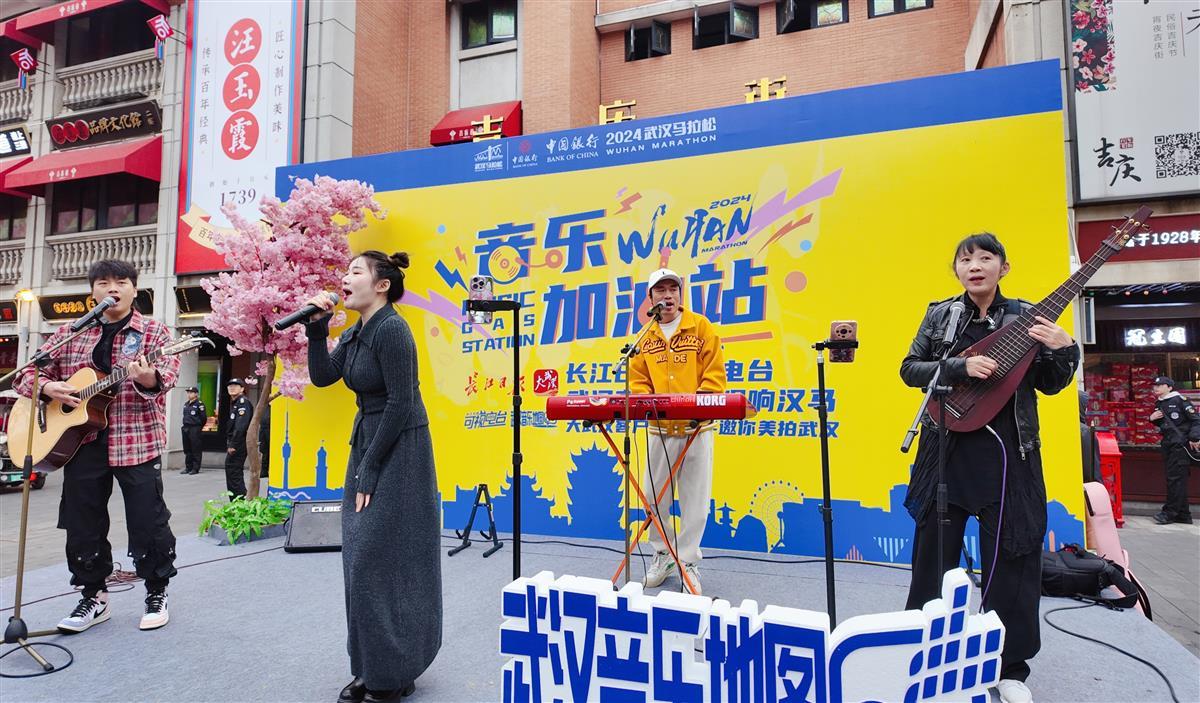 3月24日7时30分,2024武汉马拉松正式鸣枪,来自29个国家和地区的3万名马拉松爱好者纵情奔跑、狂欢。在起跑后两公里处的吉庆街,2024年武汉马拉松第一个音乐加油站,音乐人唱响赛道。武汉本土乐队功夫九头鸟乐队率先开嗓,献唱《武汉早安》,并唱响新歌《奔跑在马拉松》,用音乐为选手们加油助威。