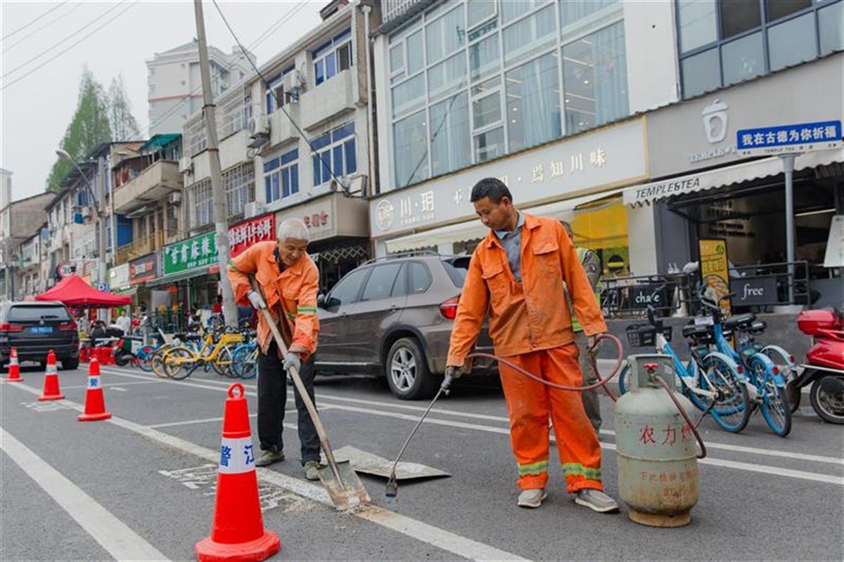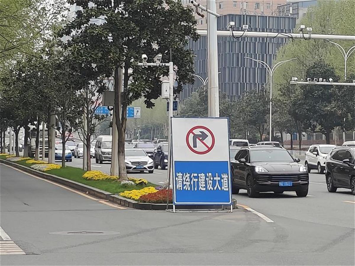 设施保障方面,为了缓解古德寺门口路段车流集中的问题,江岸交警在解放大道黄浦大街路口两侧和黄浦大街工农兵路路口分别设置3块交通标牌,分别用于工农兵路段拥堵时临时绕行建设大道和二七路的禁止右转标志和指示标志。在古德寺门口施划了网格线,取消了古德寺门口的道路停车泊位。在高峰时段,还会向另一侧道路“借道”,并重新进行道路划分,提高古德寺门前路段的通行效率。同时,江岸交警联系高德地图,适时引导车辆从二七路、工农兵路到古德寺。