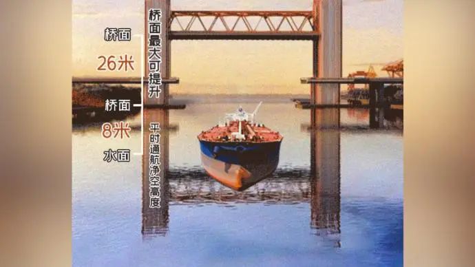 负责人说,为了方便汛期船舶通航,桥面就必须上升,“这次我们的目标是提升26米,通航净空达到34米”。
