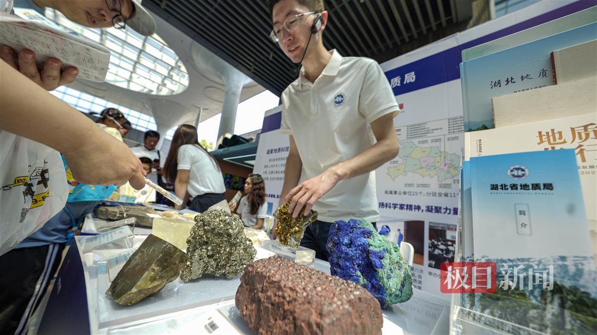 该展台展出的都是湖北典型矿物、岩石、宝石、化石标本。有一游客指着泛着金光的矿物问道:“这是黄金吗?”“不,这是‘愚人金’。”工作人员细说道,它是黄铁矿,具有明亮的金属光泽和典型的浅黄铜黄色,常被误认为是黄金,所以又称作“愚人金”。因其化学成分是二硫化铁,可用于提取硫和制造硫酸的主要矿物原料。