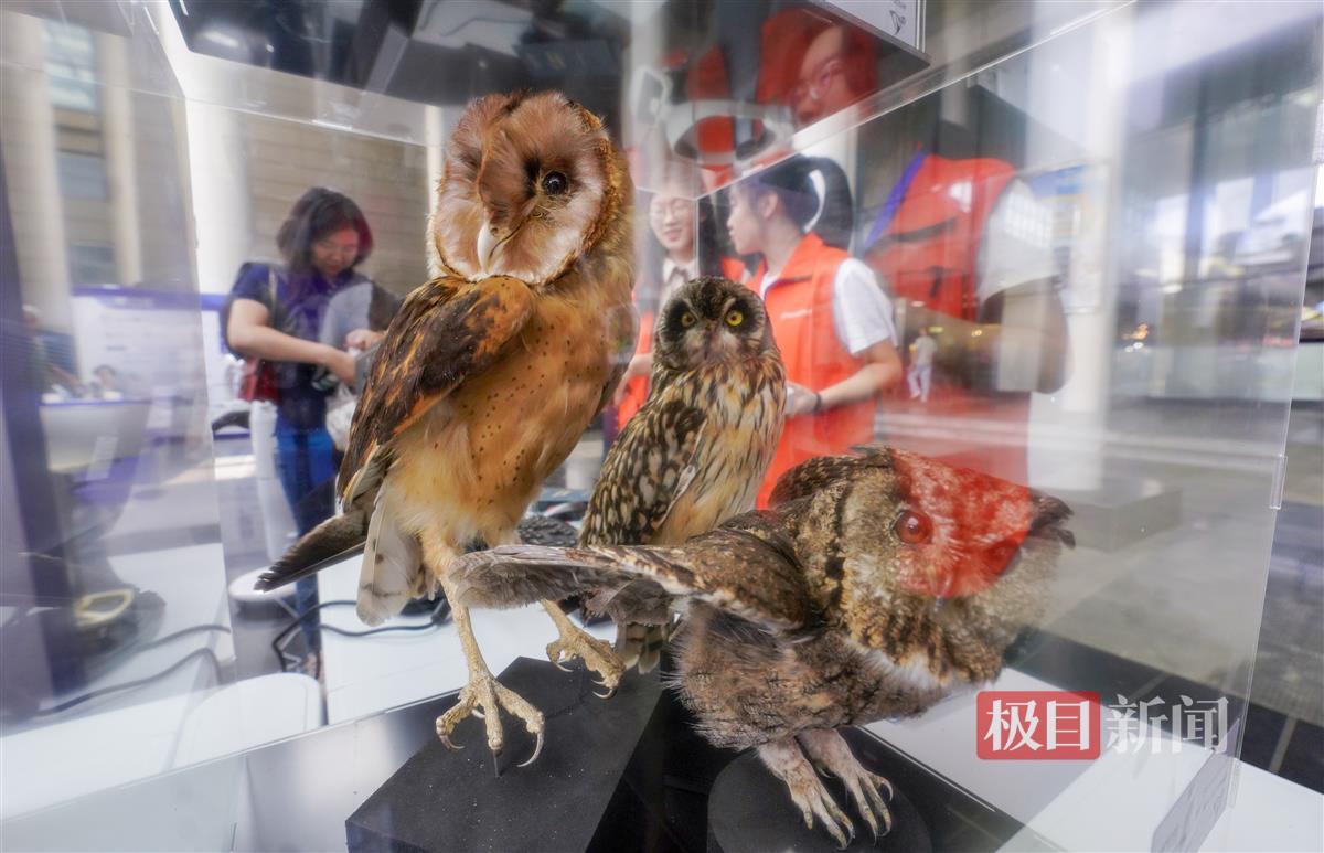 华师大展示的猴面鹰(左一)、领角鸮(右一)等生物标本
