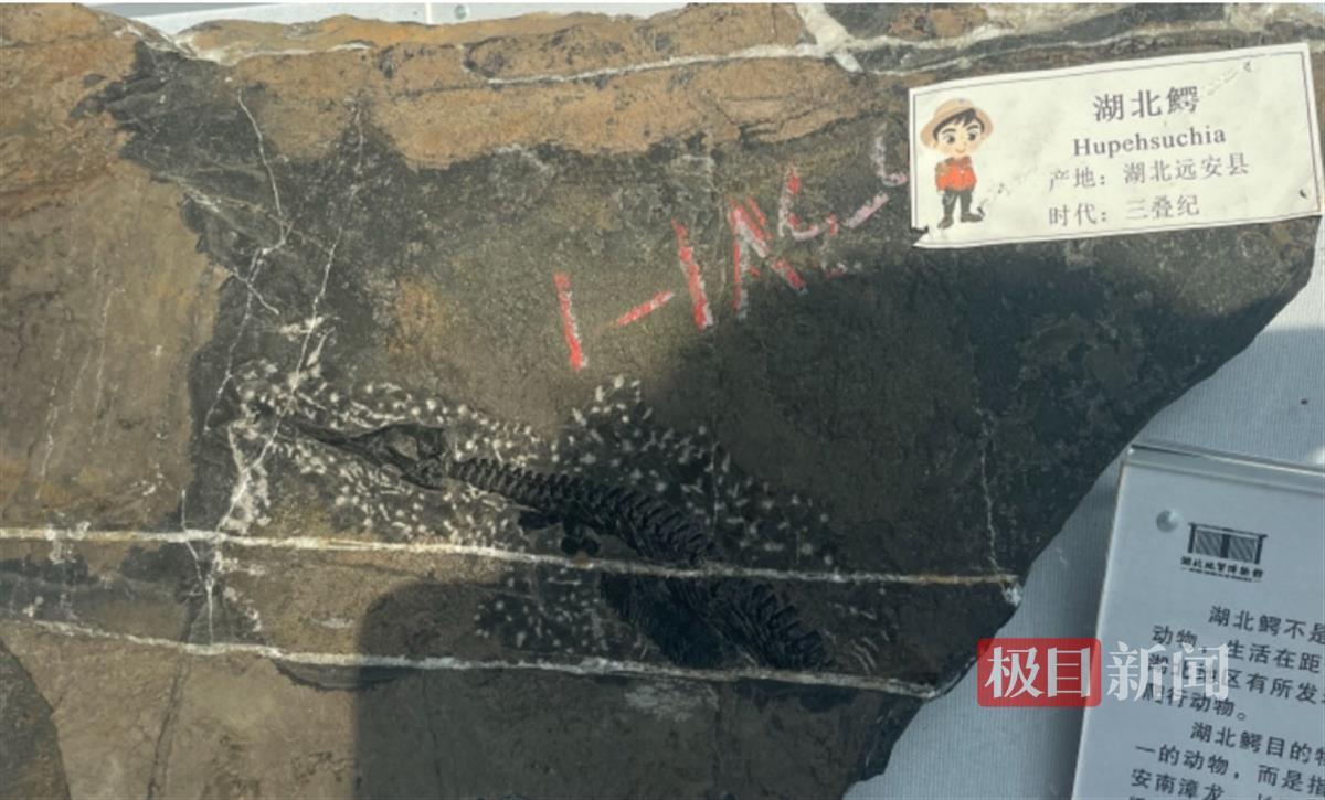 这块湖北鳄化石的标签上写明产地是湖北省远安县,那2亿年前的远安就不是陆地了?“是海洋!”工作人员解释道,湖北鳄不是鳄鱼,而是一种已经灭绝的海生爬行动物,生活在距今约2.5亿年的海洋中。仅在湖北地区有所发现,也是唯一一种以湖北命名的海生爬行动物。