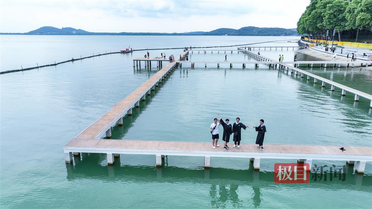 恰逢毕业季,今日凌波门特别为应届大学毕业生“送礼”——可进入拍毕业照。极目新闻记者在现场看到,很多大学生在凌波门栈桥上拍照,开心一跳,留下甜美的笑容。武汉大学数学专业大四学生朱同学告诉记者:“26日就要离开武汉了,今天来拍毕业照,不留遗憾。”