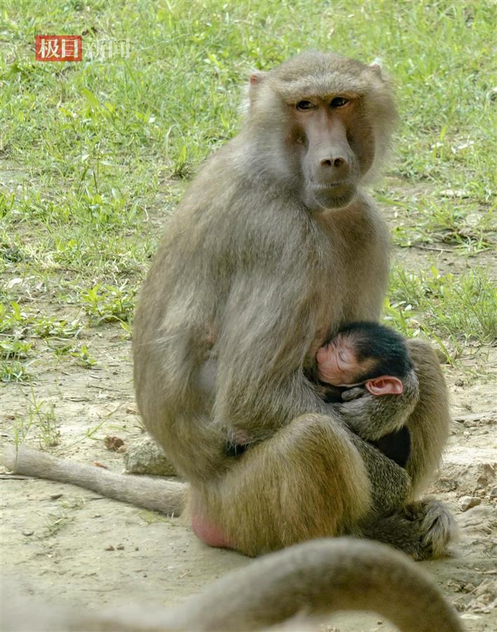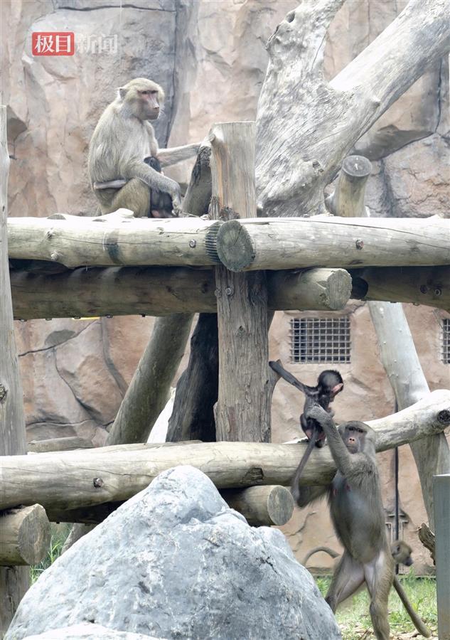 一只狒狒怀里抱着熟睡的小宝,一只狒狒站起来接住栖架上的娃,一只小狒狒正依偎在妈妈怀里撒娇……26日上午10时许,记者在阿拉伯狒狒馆偶遇这温馨一幕。