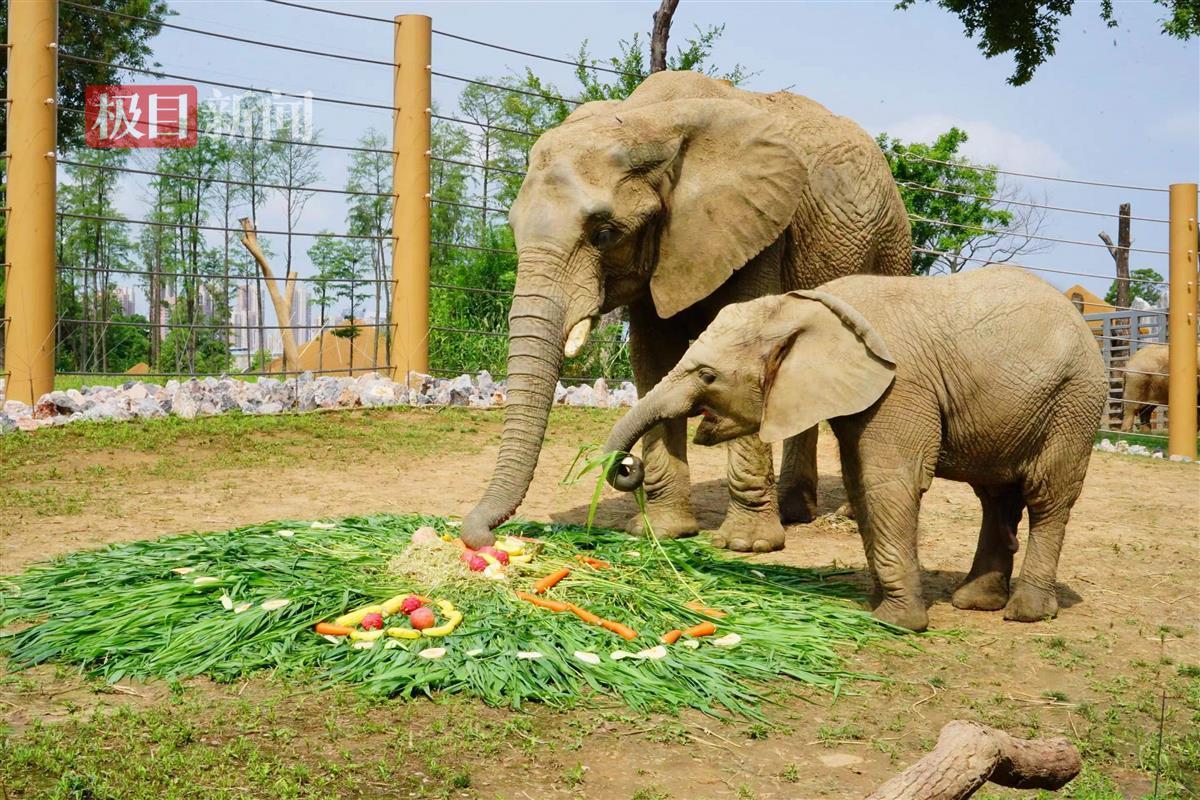 西瓜、苹果、胡萝卜、青草配置的“生日蛋糕”,有营养有颜值,蓝天白云捧场,动物保姆们热情鼓掌,活力满满的小象“申申”在母象“阿南”的陪伴下,大快朵颐地品尝生日蛋糕,其父“阿海”在旁一脸怜爱地看着它。吃完蛋糕,它活蹦乱跳,又跑到“阿南”怀里撒娇,闹着吃母乳。